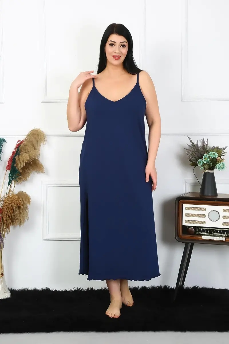 Akbeniz Women's Plus Size Spaghetti Strap Cotton Navy Blue Long Nightgown 12100 is a special design that combines home elegance with comfort. Carefully produced to make you feel your best throughout the night, this long nightgown offers a soft touch to your skin with its 90% cotton and 10% lycra content. Thanks to its cotton structure, this product has a breathable surface, allowing your skin to breathe without sweating and improving your sleep quality. The lycra content in it increases the flexibility of the nightgown, does not restrict your freedom of movement, and stretches in harmony with your body contours. Meeting the elegance of deep navy blue, this model has both a simple and very stylish appearance. Specially developed patterns for women looking for plus sizes prioritize comfort with a soft texture that wraps the body without squeezing. Thanks to its thin straps, it does not add weight to the shoulders and provides ideal coolness for warm summer evenings. Designed to make you feel stylish and refreshed while resting your body, which is tired all day, this nightgown also looks quite elegant with its long cut. A candidate to be the favorite piece of your home wear collection, this product signed by Akbeniz is also quite durable against washing with its quality texture and long-lasting fabric structure. The 3XL size displayed on the mannequin gives a clear idea of how the product will look on you. Discover this special nightgown offered with Akbeniz quality now for women who both value comfort and do not want to compromise on their style.