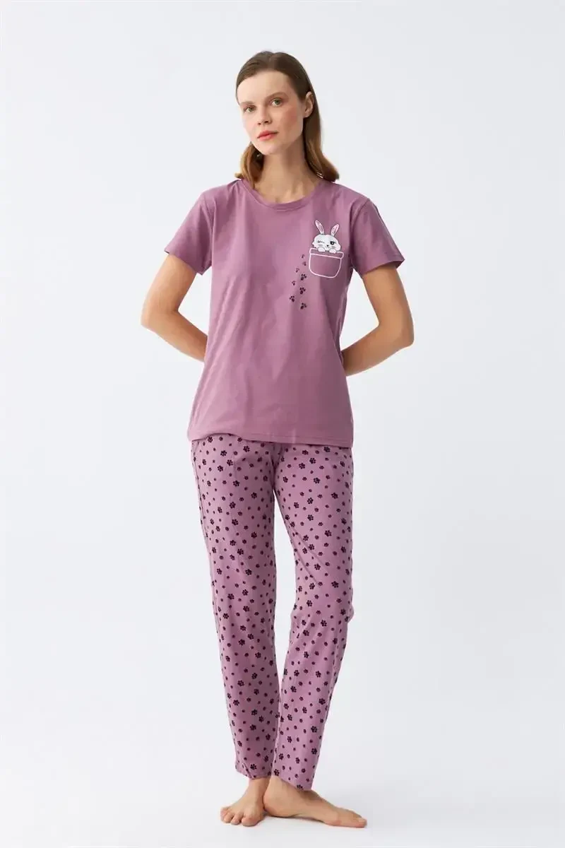 Akbeniz Purple Rabbit Pajamas Set | Women's Pocketed Comfortable Pajamas
