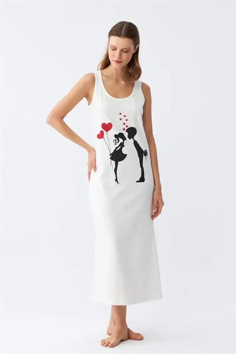 Akbeniz nightgown, women's nightgown, combed cotton nightgown, long nightgown, ecru nightgown, thick strap nightgown, comfortable nightgown, stylish nightgown, women's pajamas, loungewear