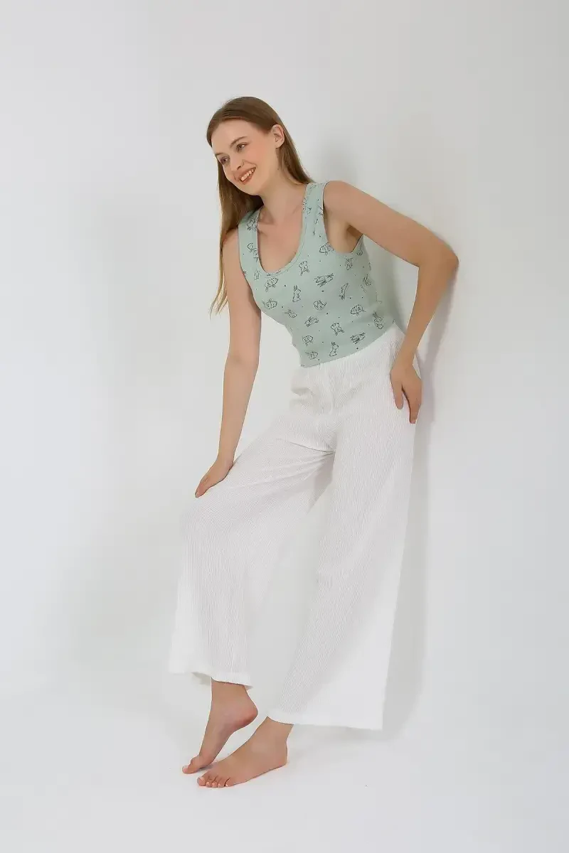 женский комплект, боди на широких бретелях, брюки клеш, комплект из 2 предметов, высокая талия, хлопковая ткань, удобный крой, белый комплект, летний комплект, Akbeniz