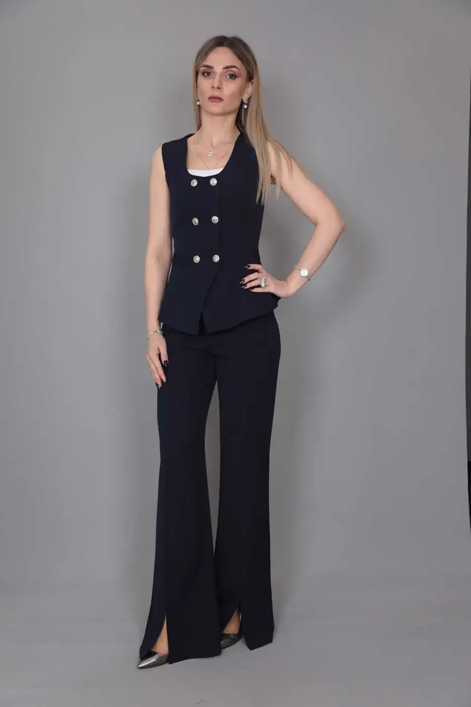 The Aller Vest & Spanish Slit Pants Set, which combines elegance and comfort, will be an indispensable part of your wardrobe. This set, with its navy blue color, will suit every style and make you look stylish and elegant on special occasions or in everyday life.