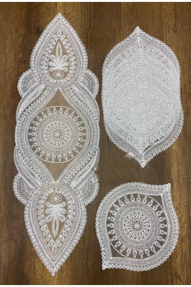 American Placemat, 1 Runner 6 Charger Plate Cream Dinnerware Set, Tablecloth Set, Serving Presentation Set-MLD**Product Description**Table setting is an integral part of the dining experience, and when hosting guests or enjoying a pleasant dinner with your family, the aesthetics of your table play an important role. This is where the American Placemat, 1 Runner 6 Charger Plate Cream Dinnerware Set comes into play. This special set adds elegance to your tables with its elegant design and useful structure, while also taking your food presentations to the next level. The warm and inviting tone of cream color easily adapts to all kinds of decoration styles, creating a timeless elegance on your table. Whether you have a modern, classic or rustic style, this serving set will add a perfect touch to your tables. Each piece in this set is made of carefully selected materials and is designed for long-lasting use. Runner, charger plates and American placemats combine both aesthetic appearance and practical use, offering elegance and order together on your tables. When serving your meals, charger plates and American placemats allow you to safely place your plates and protect your tablecloth from stains. The runner adds an elegant detail to the center of your table, completing your table setting. This set is ideal not only for special occasions but also for daily use. Whether you are having breakfast with your family, lunch or dinner parties, it always ensures that your table looks stylish and tidy. American Placemat, 1 Runner 6 Charger Plate Cream Dinnerware Set is also a meaningful and useful gift that you can give to your loved ones. You can make an unforgettable surprise with this set to a newly married couple, a friend who is a host, or a loved one who loves to cook. American Placemat, 1 Runner 6 Charger Plate Cream Dinnerware Set is an ideal choice to add value to your tables, beautify your food presentations and create unforgettable memories. Experience both elegance and functionality on your tables with this set.**Product Features*** Cream color, compatible with every decoration style.* Includes 1 runner, 6 charger plates and American placemats.* Made of carefully selected, high-quality materials.* Designed for long-lasting use.* Protects the tablecloth from stains.* Adds value to tables with its stylish and elegant design.* Ideal for daily use and special occasions.* Can be given as a gift to loved ones.* Offers elegance and order together on tables.* Takes food presentations to the next level.**Additional Information**The product is easy to clean, can be wiped with a slightly damp cloth. Please avoid using bleach or harsh chemicals. It is recommended to follow the instructions for use in order to use your product like the first day for many years. You can review the product label for detailed information about the dimensions and material content of the product. This special set, offered with the assurance of the MLD brand, aims to add quality and elegance to your tables.