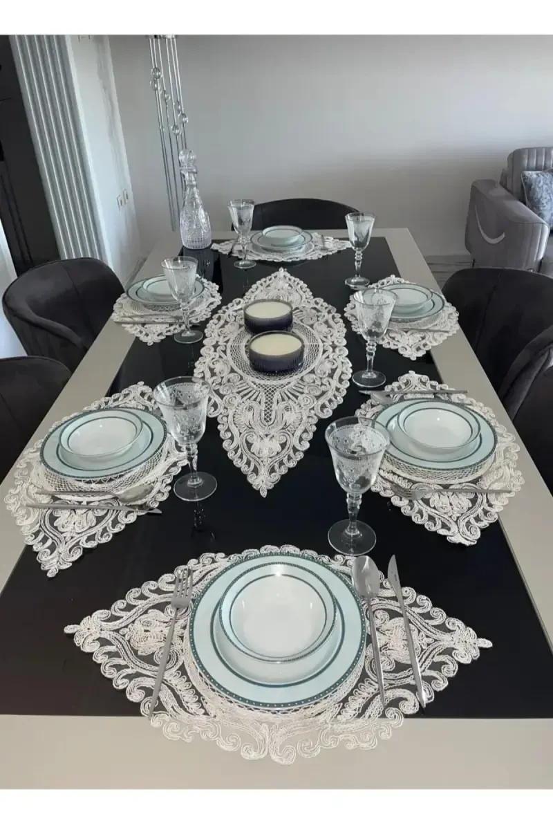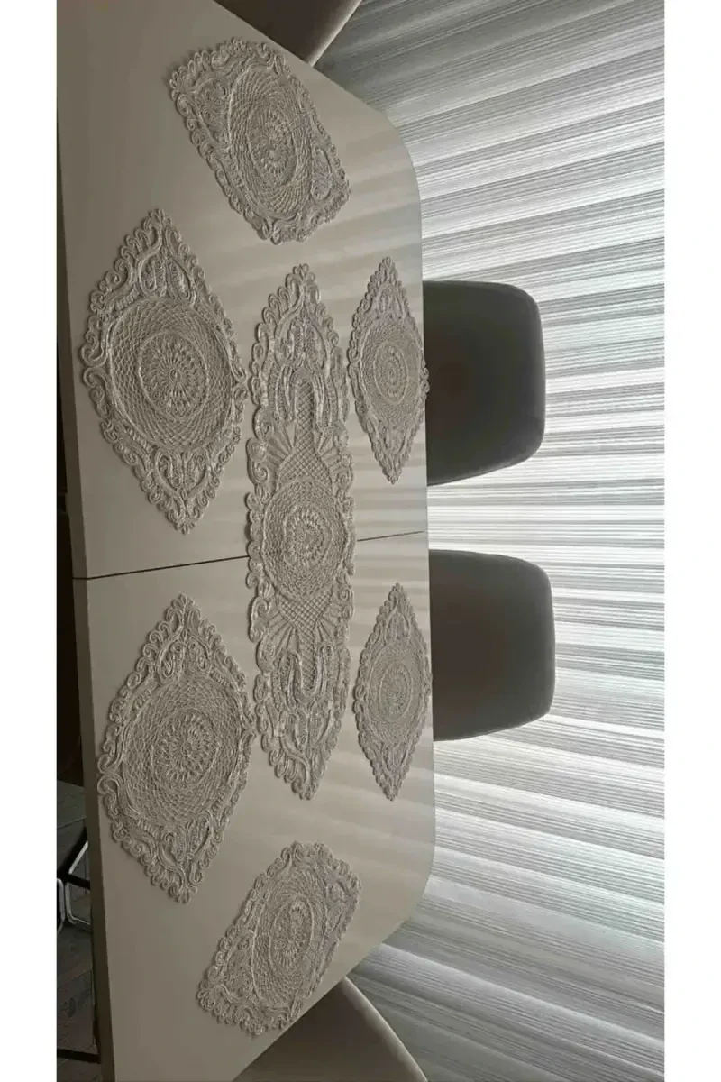 Add elegance and style to your tables with the American Placemat, 1 Runner 6 Charger Plate Dinnerware Set, Tablecloth Set, Serving Presentation Set! This special set, offered with Çeyizci Tekstil quality, is designed to turn your meals into an unforgettable experience. The harmony of Cream and Cream2 colors offers a timeless aesthetic that easily adapts to any decoration. This set is not just a dinnerware set, but also a work of art that adds value to your tables. The durability of the polyester material and the softness of the cotton texture combine to offer both long-lasting use and a comfortable experience. Its round design creates a modern and stylish look, while its 8% elastane content gives it a flexible structure, so it fits your tables perfectly. With this set, you will make not only your meals but also your memories special. Remember, you can order a maximum of 10 of this product and you have the option of free returns within 15 days. Don't miss this unique opportunity to add value to your tables and impress your guests!