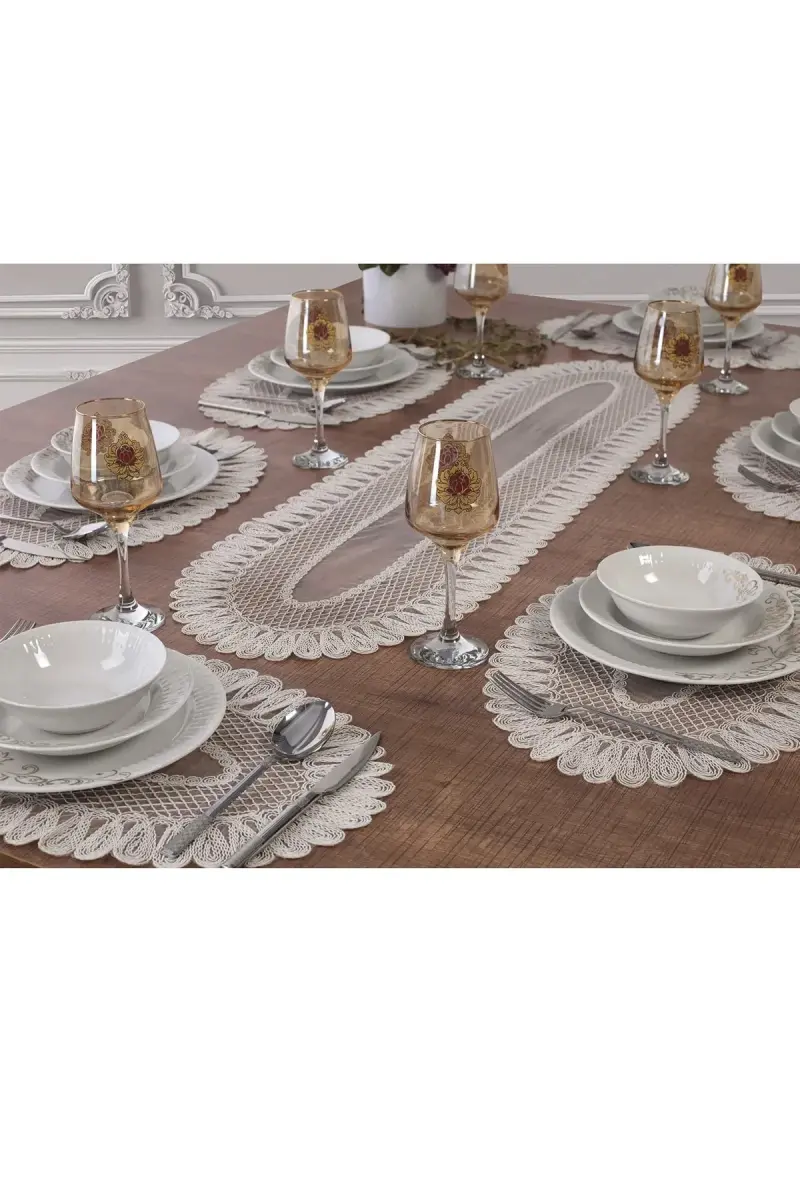 Amerikan Servis, 1 Runner 6 Supla Krem Yemek Servis Takımı, Masa Örtüsü Seti, Servis Sunum Seti-MLD