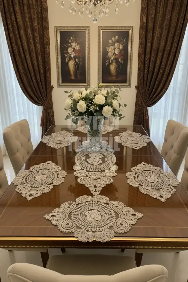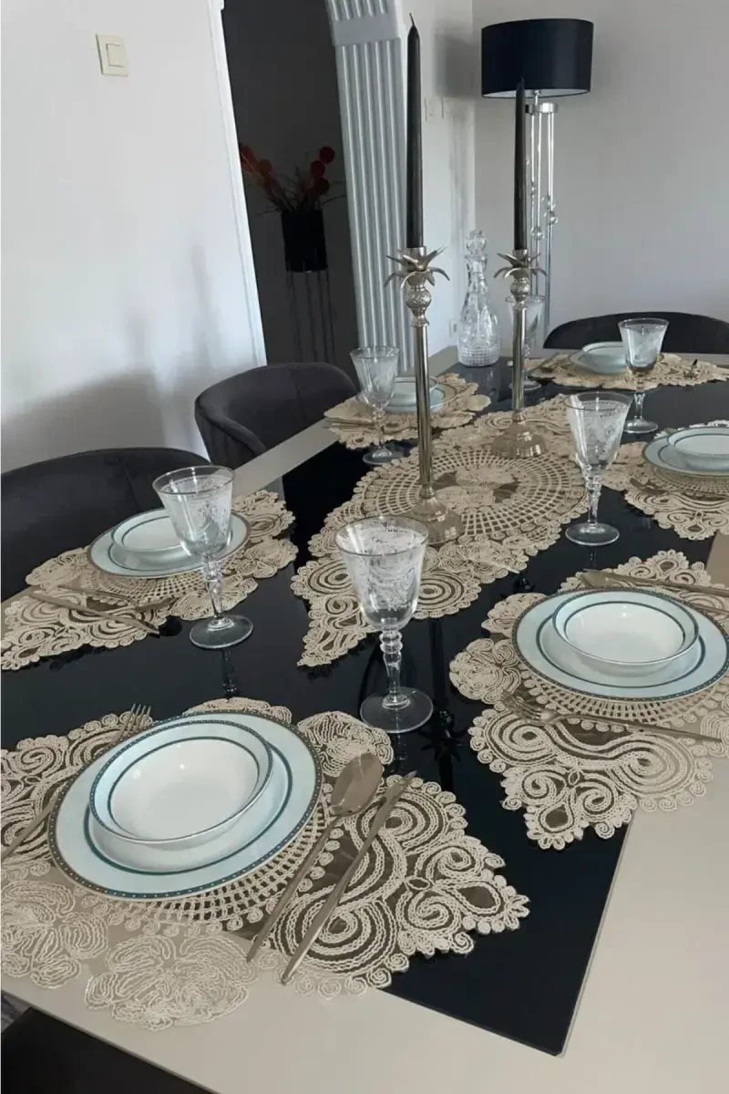 Идеальный выбор для придания вашему столу шикарного и современного вида, американская сервировка сделает ваши повседневные трапезы особенными. Набор, включающий в себя 1 раннер, 6 подставок для столовых приборов и стильную скатерть, разработан таким образом, чтобы соответствовать любому обеденному столу.