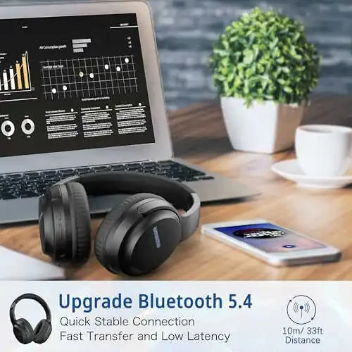 AMORNO Bluetooth Quloqchinlar, 68 soat o'ynash muddati, mikrofonli simsiz quloqchin, katlanadigan sozlanadigan yengil HiFi stereo quloqchin, mobil telefon/kompyuter/ish/sayohat/uy/ofis uchun (Qora)