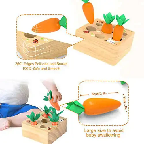 Safe Material: Made of New Zealand natural pine wood with water based paint. Non-toxic, smoothly surface. 100% safe for your baby. NOTICE: Please wipe clean the toy with mild detergent and damp cloth. Do not put it into water as the water may soak into the wood and make the paint peel. Avoid sun exposure. Sorting Game: Your baby will need to recognize the size of carrots to put them back to the slot. Developmental Benefits: While playing with this wooden toy, your little one is also developing fine motor skill, hand-eye coordination, shape recognition and dexterity. Great Gift: Best choice for preschool toddlers as their birthday present. The cute design will always catch babies' eyes. Tested according to requests. No choking hazard. If you'd like to check the test results, please feel free to contact. This educational wooden toy is designed to encourage early age kids to be independent, resourceful and pragmatic explorers in the world around them.