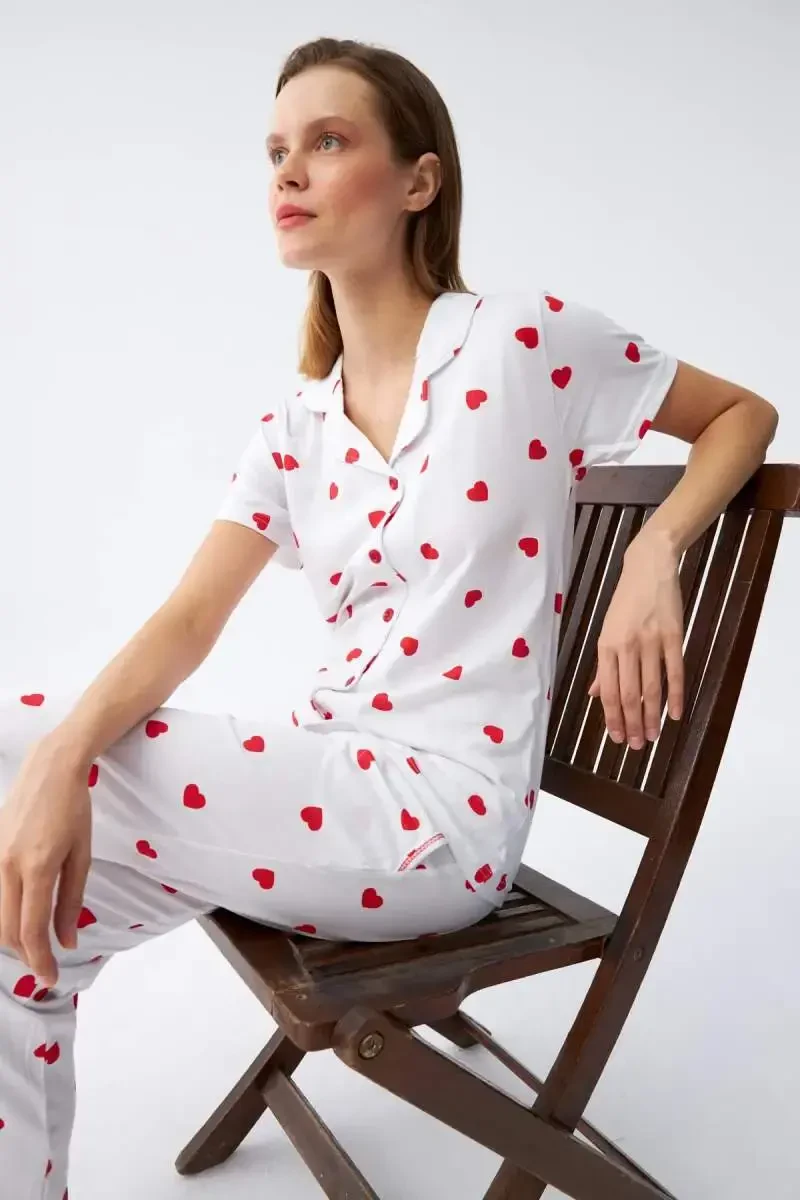 Pijama takımı, ayollar pijamasi, Angelino, oq pijama, qizil yurakli, paxtali pijama, oldindan tugmali, qulay pijama, uy kiyimi, sovg'a pijama
