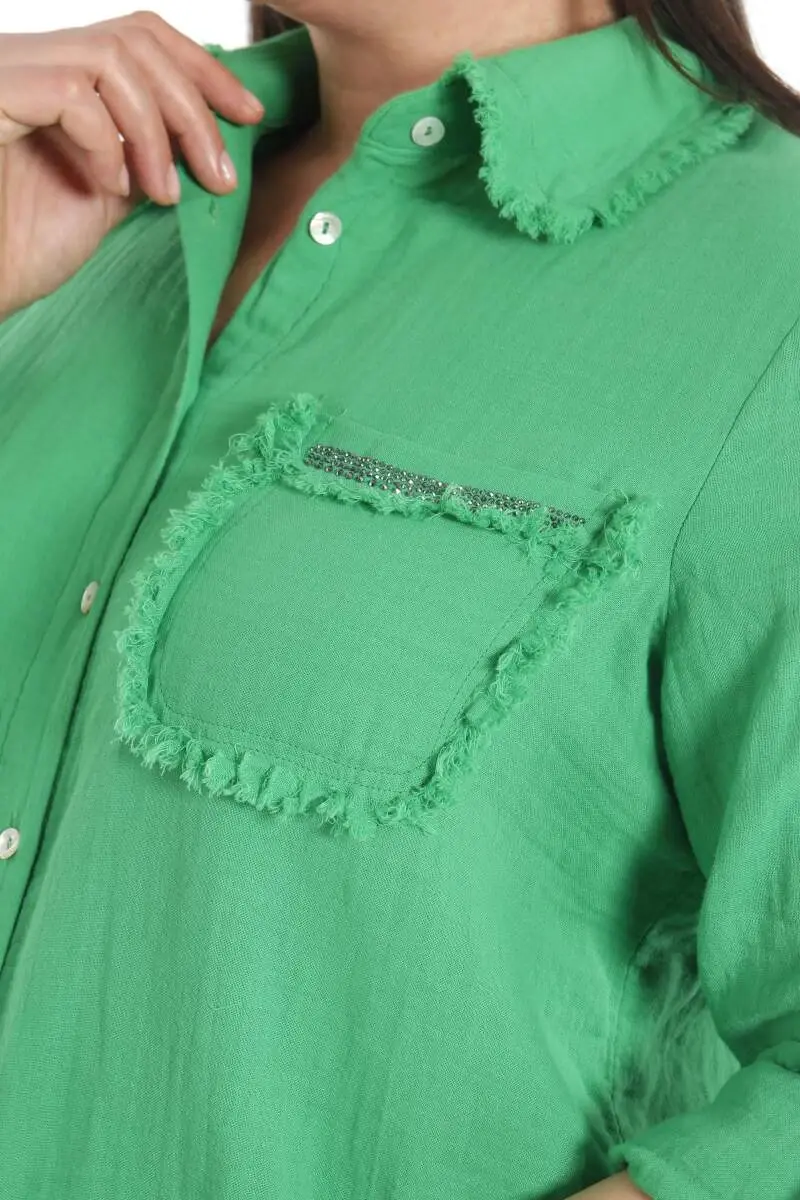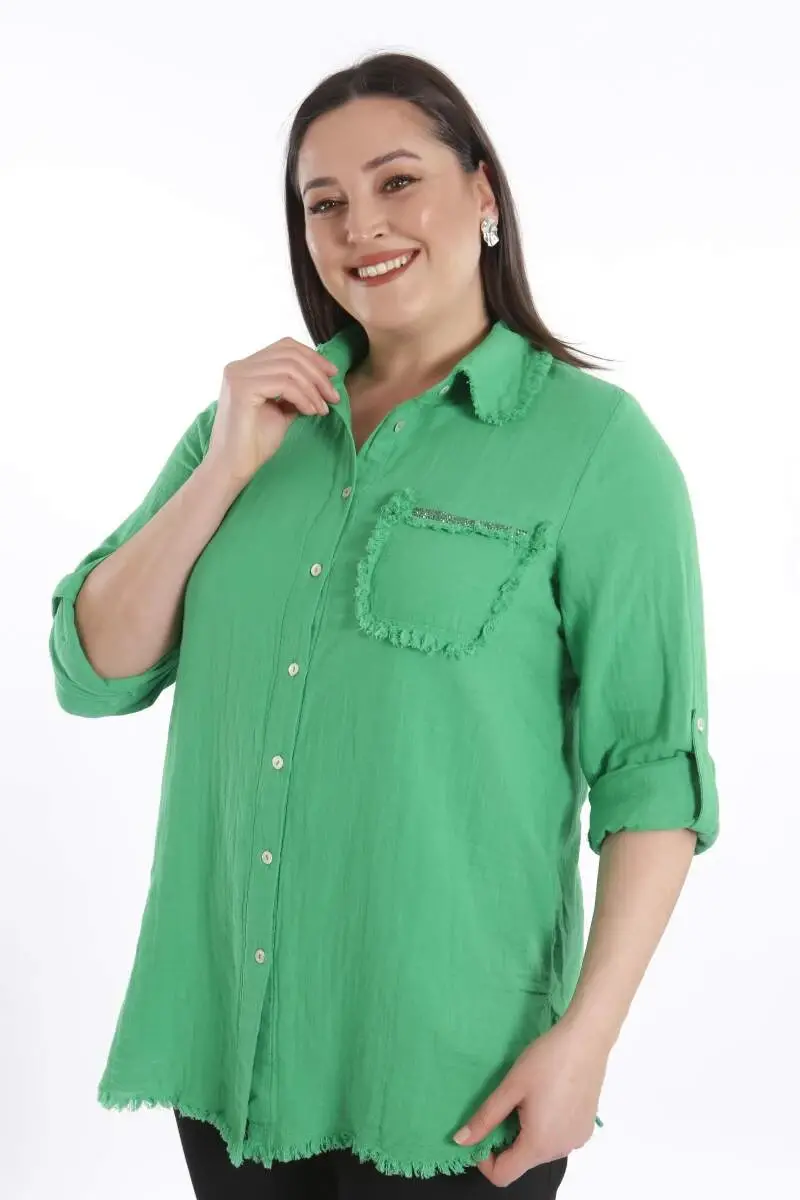 Angelino Büyük Beden Cep Taş Baskılı Eteği Saçaklı Muslin Yeşil Gömlek