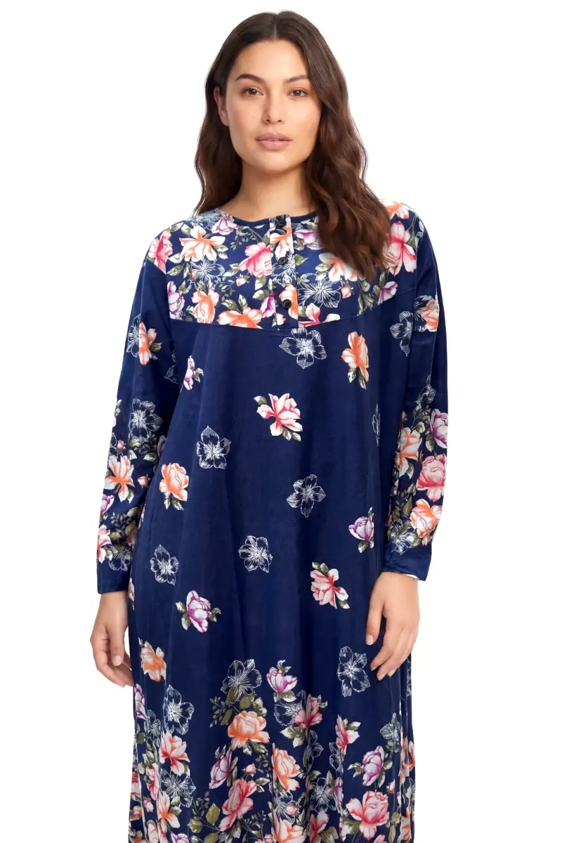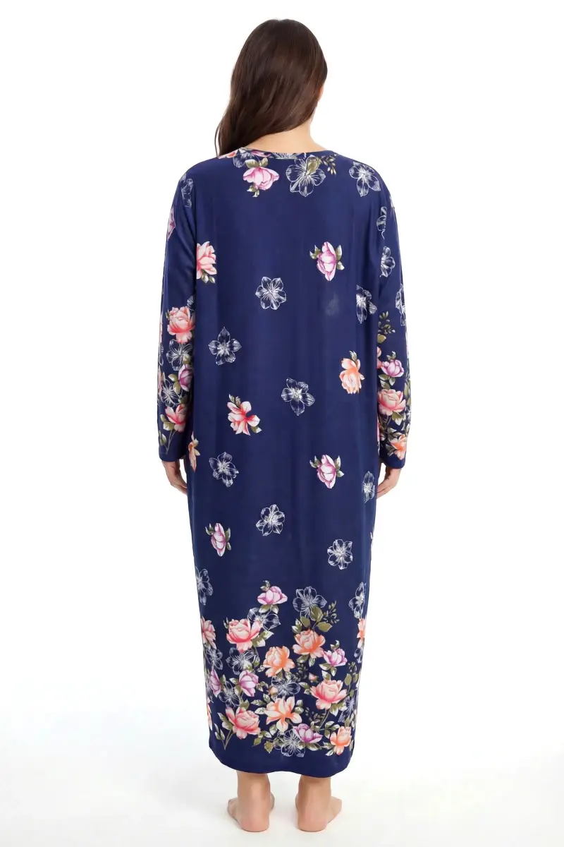 Angelino Büyük Beden Çiçek Desenli Uzun Kollu Anne Geceliği Lacivert