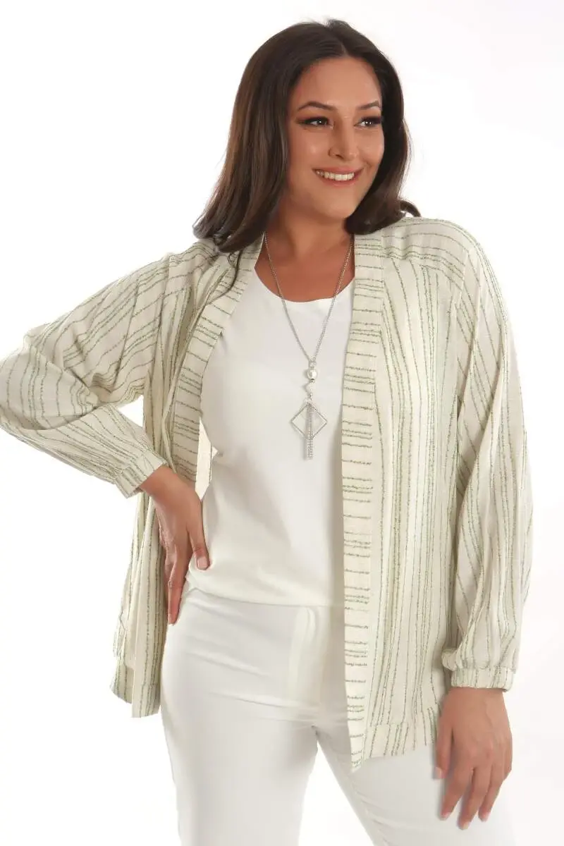 Angelino Büyük Beden Çizgili Oversize Yeşil Ceket Ürün Özellikleri: Rahat kalıbı ile kullanımı kolay Kumaşı çizgi detaylı Yaka bant detaylı Kalça altı boy Ürün Açıklaması: Angelino Büyük Beden Çizgili Oversize Yeşil Ceket, klasik kesimi yuvarlak yaka detayı ve dokusu ile maskülen tavrı vurgulamanıza yardımcı oluyor. Ceket modelinin ön taş detayı çarpıcı bir görünüm yaratıyor. Renk: Yeşil Malzeme: %80 Viskoz - %20 Keten Manken Ölçüleri: Omuz: 47 cm. - Göğüs: 97 cm. - Basen: 105cm - Bel: 80 cm. - Boy: 1,80 cm. Ürün boyu 75 cm. 'dir. Model Bedeni: 44
