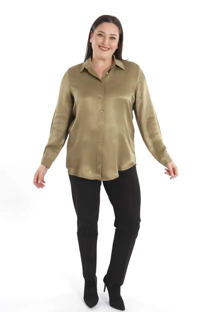 Angelino Büyük Beden Floş Viskoz Haki Basic Gömlek