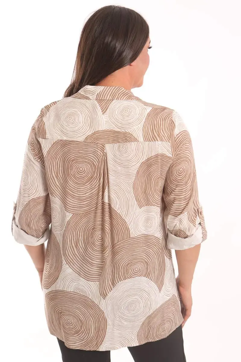 Angelino Büyük Beden Kahverengi Yuvarlak Desenli Viskon Gömlek
