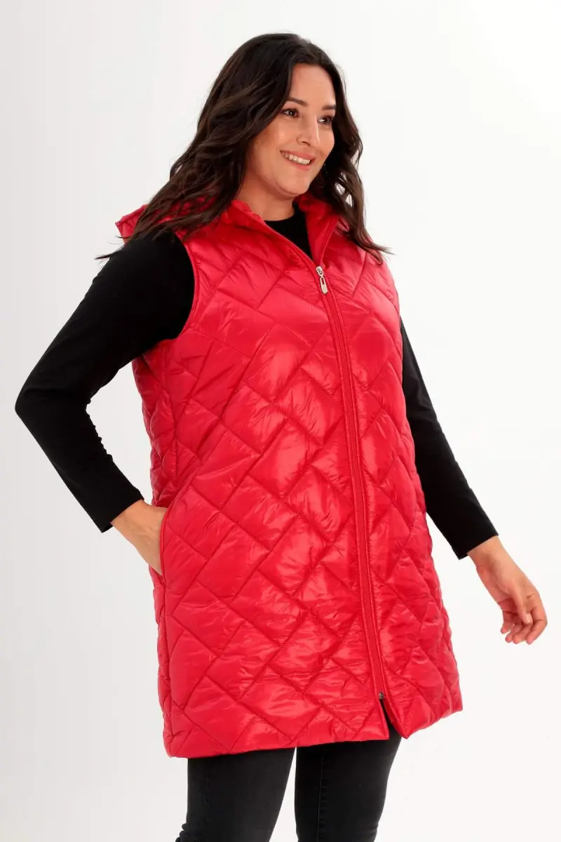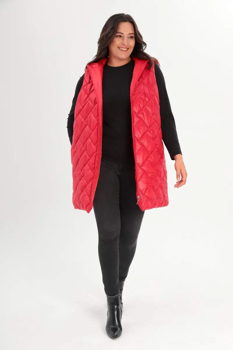 Angelino Büyük Beden Kapüşonlu ve Cep detaylı Uzun Büyük Beden Kırmızı Şişme Yelek