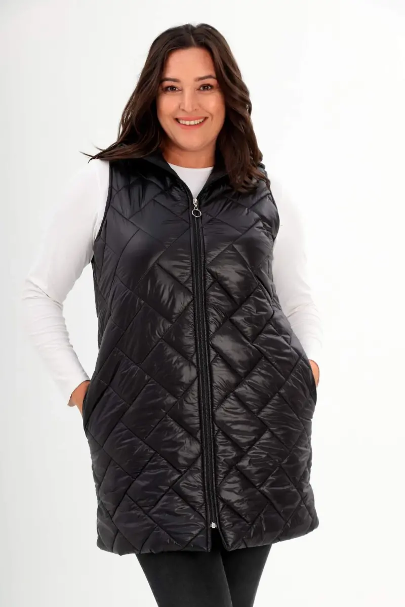 Angelino Büyük Beden Kapüşonlu ve Cep detaylı Uzun Büyük Beden Siyah Şişme Yelek