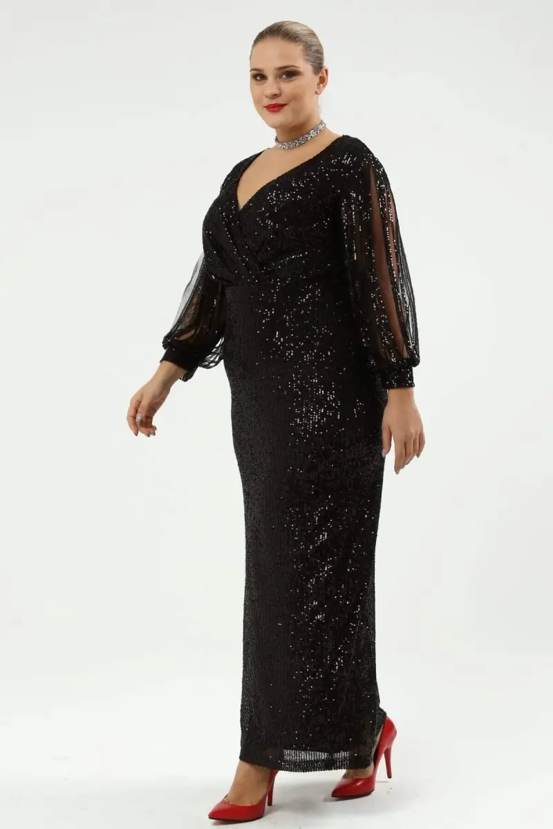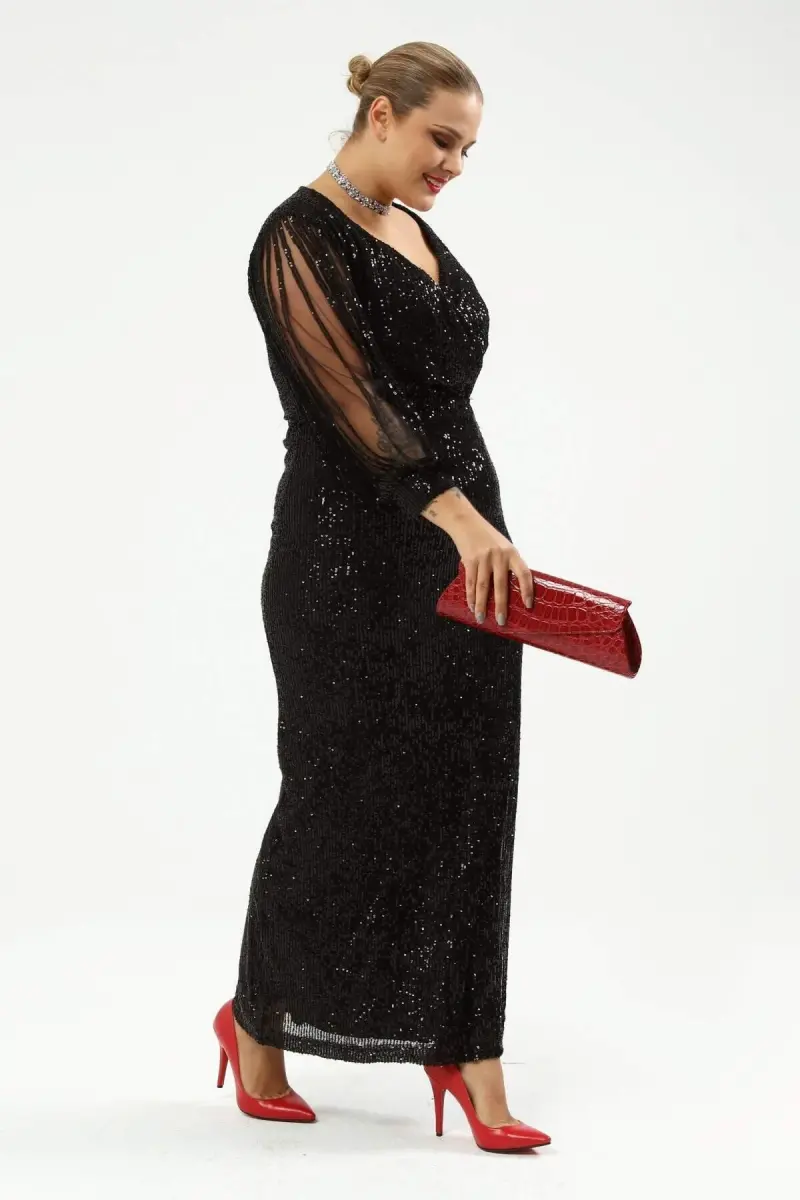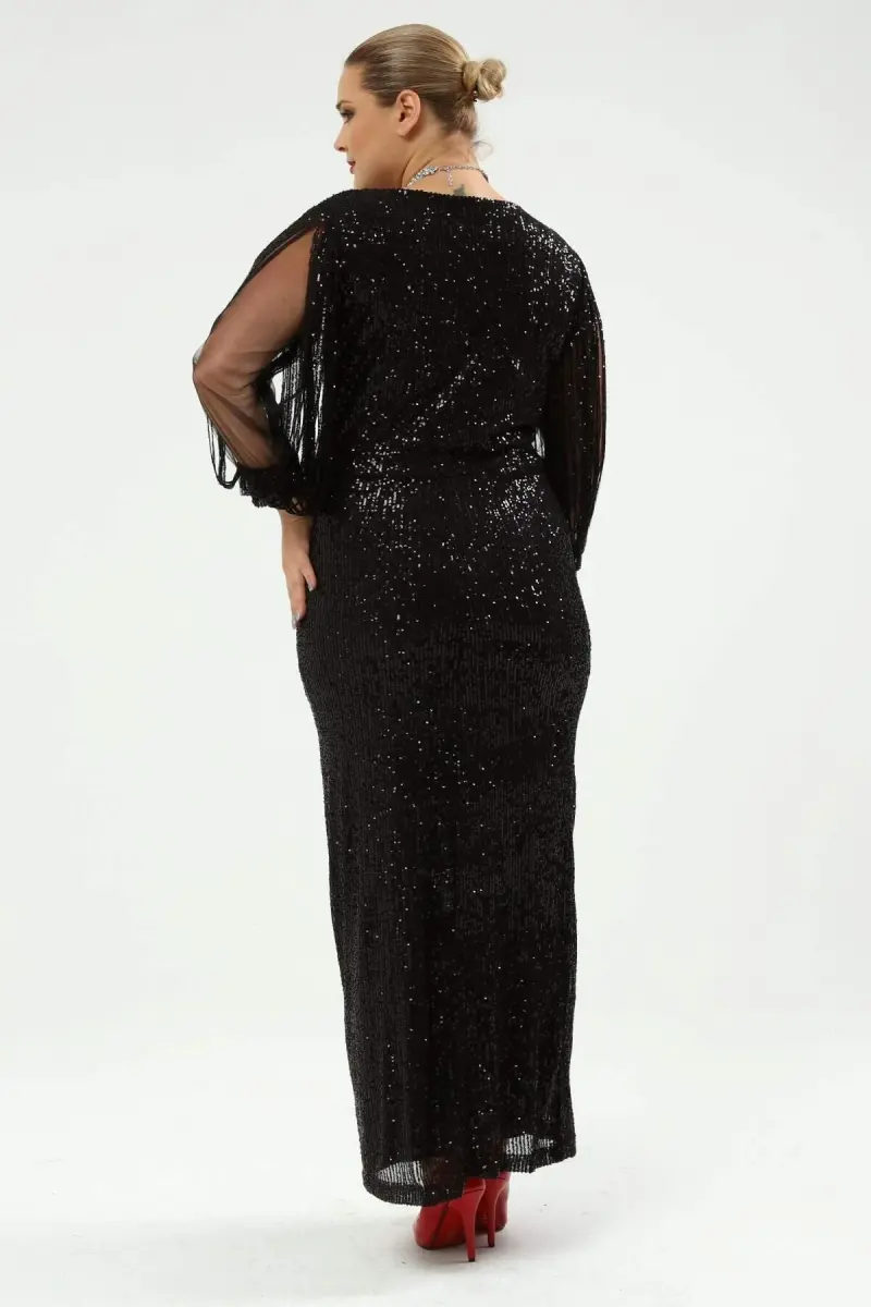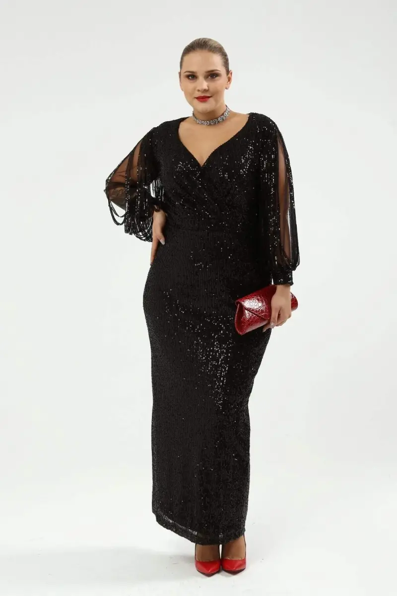Angelino Büyük Beden Kolları Saçaklı Uzun Pul Payet Abiye Elbise Siyah KL8035
