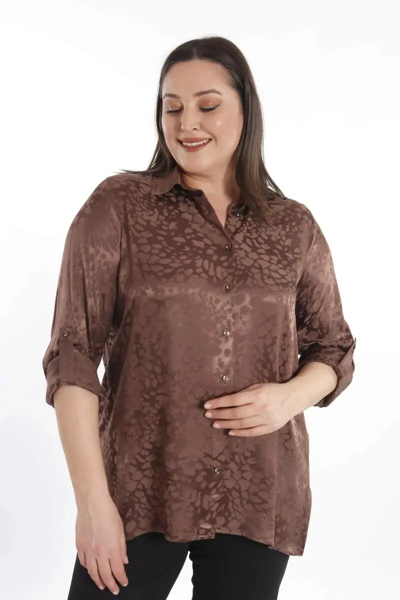 Angelino Büyük Beden Leopar Desenli Floş Kahverengi Viskoz Gömlek