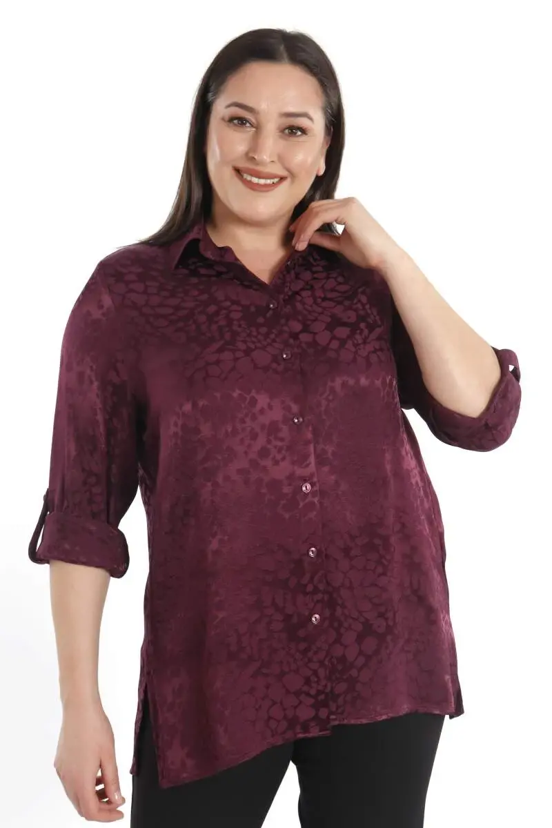 Angelino Büyük Beden Leopar Desenli Floş Mürdüm Viskoz Gömlek