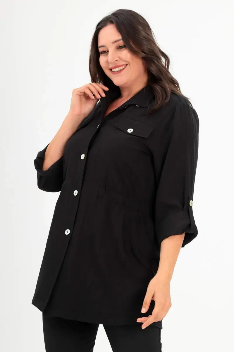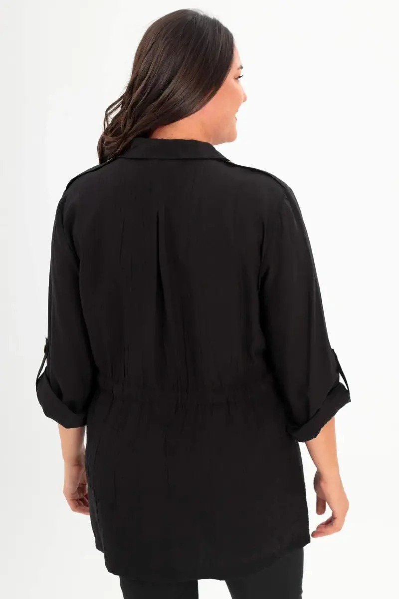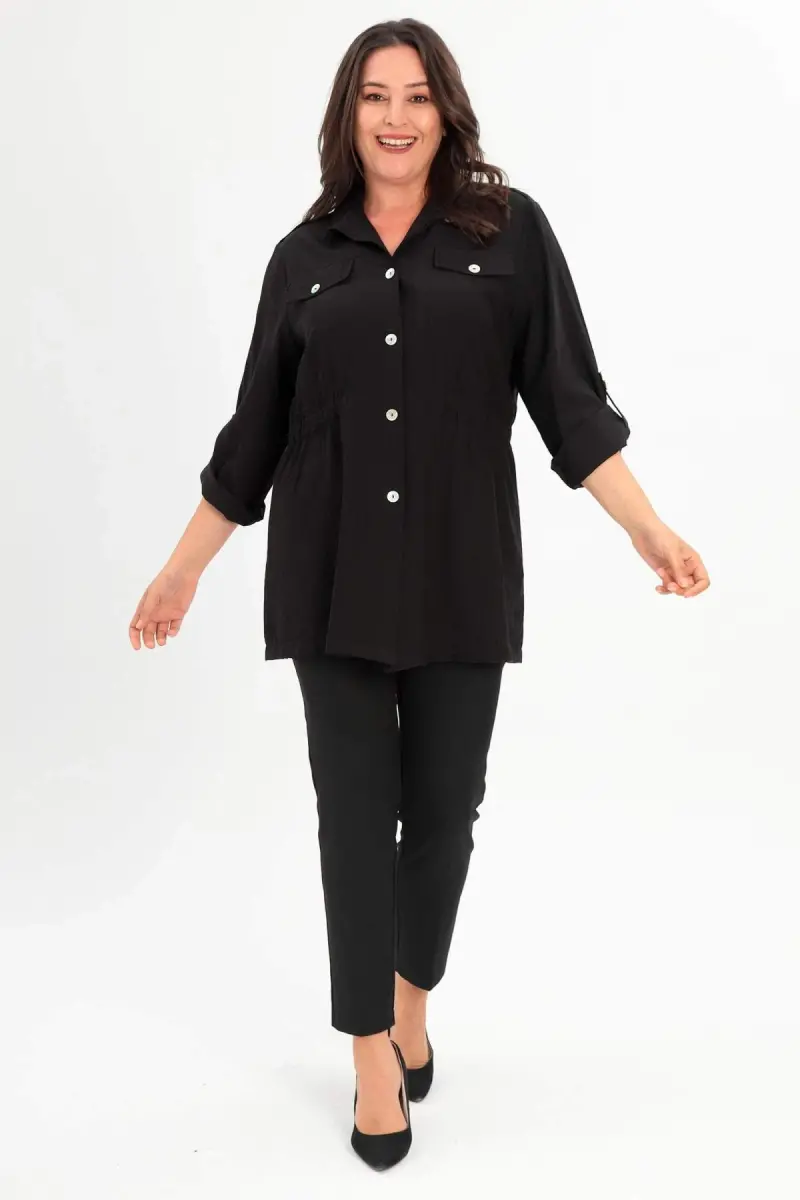 Angelino Büyük Beden Omuz Apoletli Cep Kapaklı Siyah Trençkot