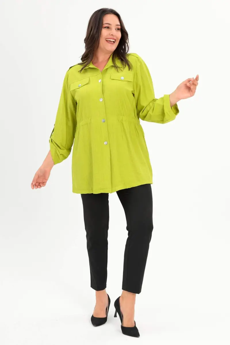 Angelino Büyük Beden Omuz Apoletli Cep Kapaklı Yağ Yeşili Trençkot