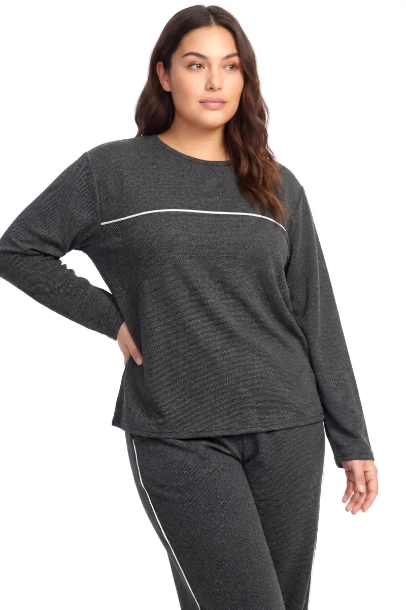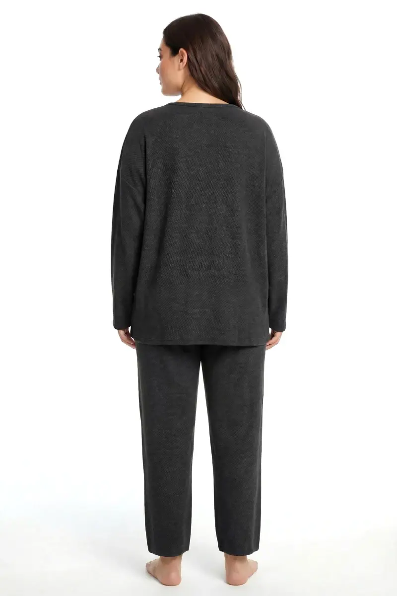 Angelino Büyük Beden Şerit Detaylı Kalın Uzun Kollu Kadın Pijama Takımı Antrasit