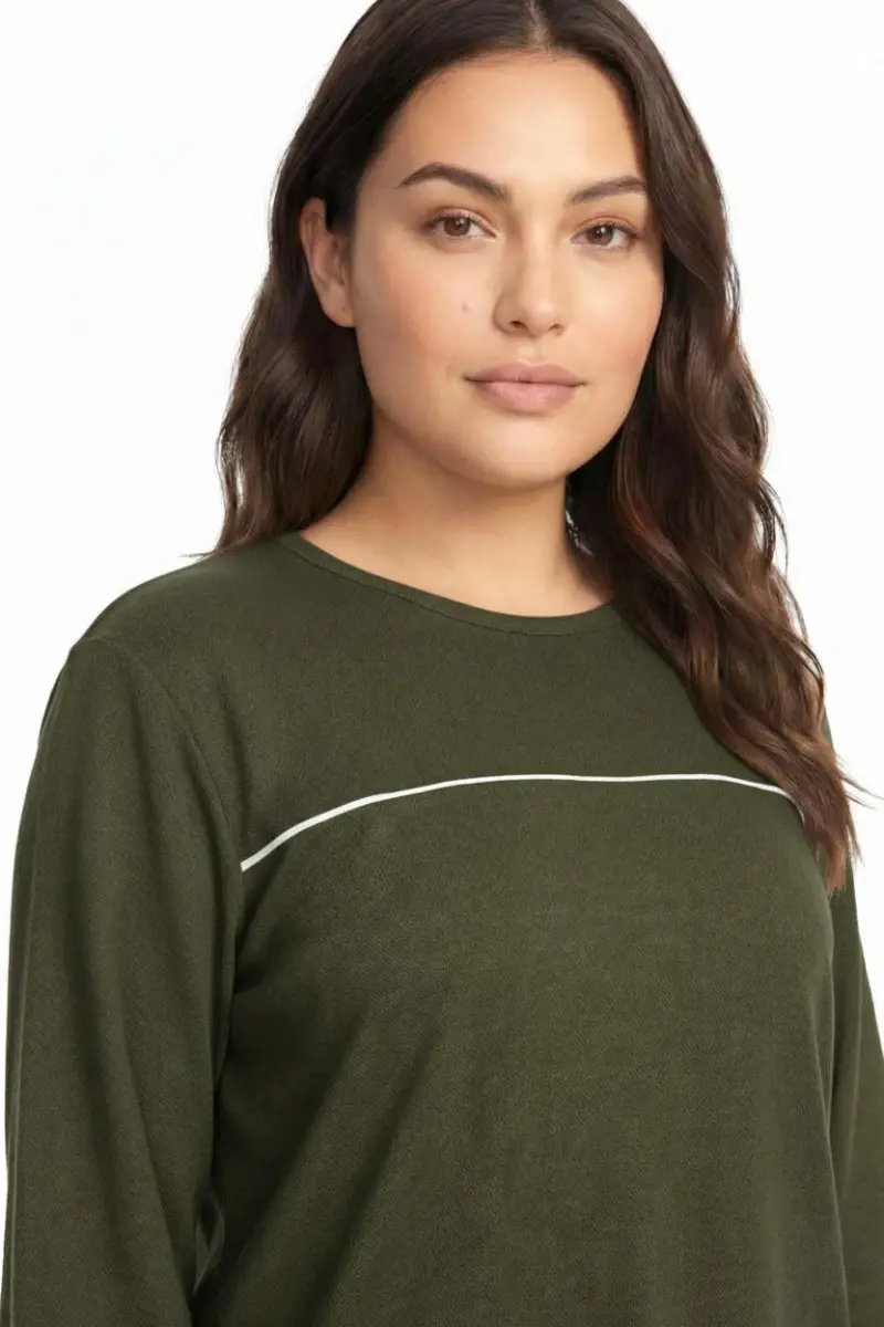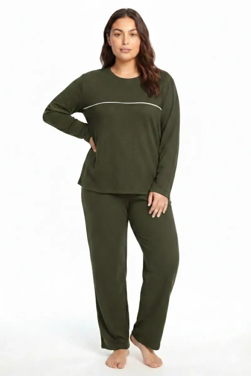 Angelino Büyük Beden Şerit Detaylı Kalın Uzun Kollu Kadın Pijama Takımı Haki