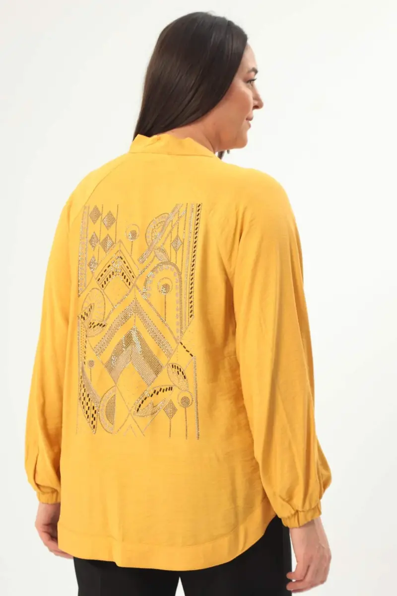 Angelino Büyük Beden Sırt Taş Baskılı Oversize Hardal Ceket