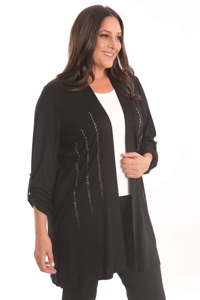 Angelino Büyük Beden Siyah Taş Baskılı Uzun Hırka Ürün Özellikleri: Salaş ve rahat bir görünüm Rahat kalıbı ile konforlu kullanım Taş detayı ile şık bir görünüm Diz üstü boy Ürün Açıklaması: Angelino Büyük Beden Siyah Taş Baskılı Uzun Hırka, tasarımda kullandığı yumuşak doku ile uzun süreli kullanımda konfor sunuyor. Kıyafetlerinizi ve şıklığınızı olumsuz hava şartlarında korurken aynı zamanda tamamlayan özel parçalardan birisi olan hırka modeli sahip olduğu rahat kalıbı ile şık bir görünüm sunuyor. Renk: Siyah Malzeme: %70 Viskoz - %30 Poliester Manken Ölçüleri: Omuz: 47 cm. - Göğüs: 97 cm. - Basen: 105cm - Bel: 80 cm. - Boy: 1,80 cm. Ürün boyu 100 cm. 'dir. Model Bedeni: 44