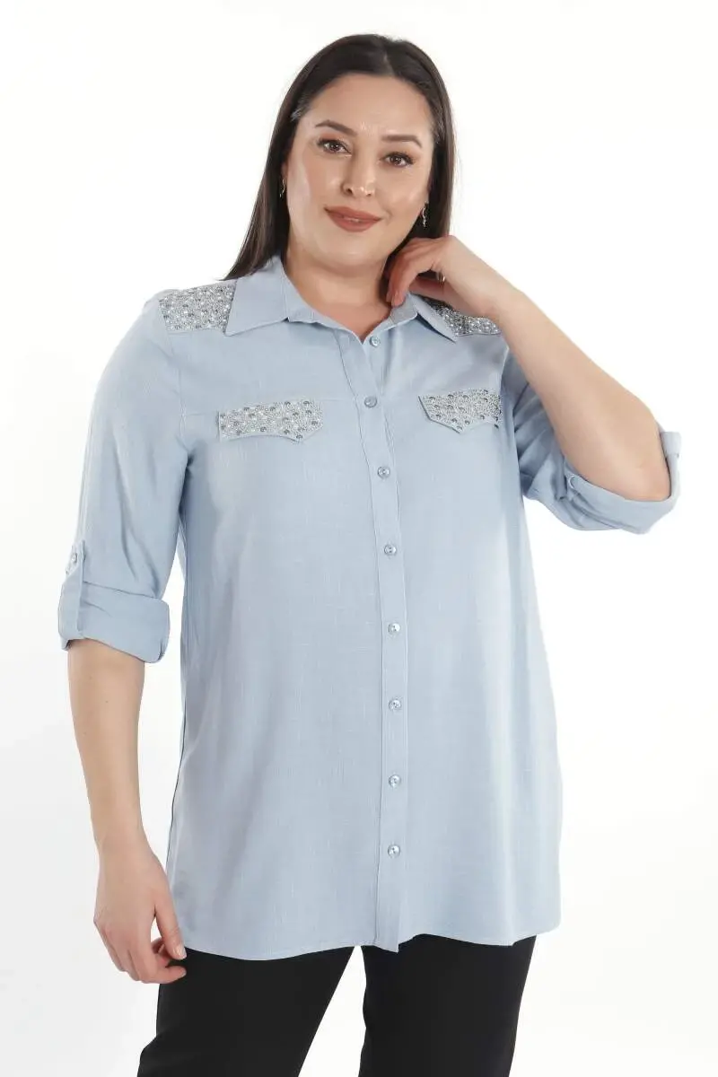 Trend42plus Büyük Beden Taş Baskılı Mavi Dokuma GömlekÜrün Özellikleri: Rahat form kalıbı ve taş baskı detayları ile göz alıcı görünümOmuz ve cep taş detayı ile dikkat çekiçi tasarımKatlanabilir kol ile işlevsel kullanımKalça altı boyTrend42plus Büyük Beden Taş Baskılı Mavi Dokuma Gömlek , bahar ve yaz aylarının bitmeyen enerjisini gömlek ile yakala! Hoş dokusu ile seni büyüleyecek olan bu parçayı kumaş pantolonlar ile birleştirmek isteyebilirsin. Hafif dokusu ile rahatlığı hissederken en yoğun günlerin bile enerjik geçecek!: )Renk: MaviMalzeme: % 80 Viskoz - % 20 KetenManken Ölçüleri: Omuz 47 cm. - Göğüs 97 cm. - Basen 105 cm. - Bel 82 cm. - Boy 1,79 cm. 42 Beden: On Omuzdan Boy: 79,3 cm. -Göğüs: 60,5 cm. -Bel: 58,7 cm. -Kalça: 66,7 cm. -Kol Boyu: 61,56 cm. -Pazu: 42,8 cm. 44 Beden: On Omuzdan Boy: 80,3 cm. -Göğüs: 63 cm. -Bel: 61,3 cm. -Kalça: 69,4 cm. -Kol Boyu: 62 cm. -Pazu: 44,9 cm. 46 Beden: On Omuzdan Boy: 81,3 cm. -Göğüs: 65,6 cm. -Bel: 64 cm. -Kalça: 72 cm. -Kol Boyu: 62,7 cm. -Pazu: 46,9 cm. 48 Beden: On Omuzdan Boy: 82,3 cm. -Göğüs: 70,8 cm. -Bel: 69 cm. -Kalça: 74,8 cm. -Kol Boyu: 63,3 cm. -Pazu: 49 cm. Ürünün boyu 75 cm. 'dir.Manken 44 beden'dir.Renk ve beden'e göre 1-2 cm. oynamalar olabilir.Yıkama Talimatı: Ağartma yapılamaz,Düşük Isıda Ütüleyiniz,Sadece Kuru Temizleme,Tamburlu Kurutucuda Kurutulmaz