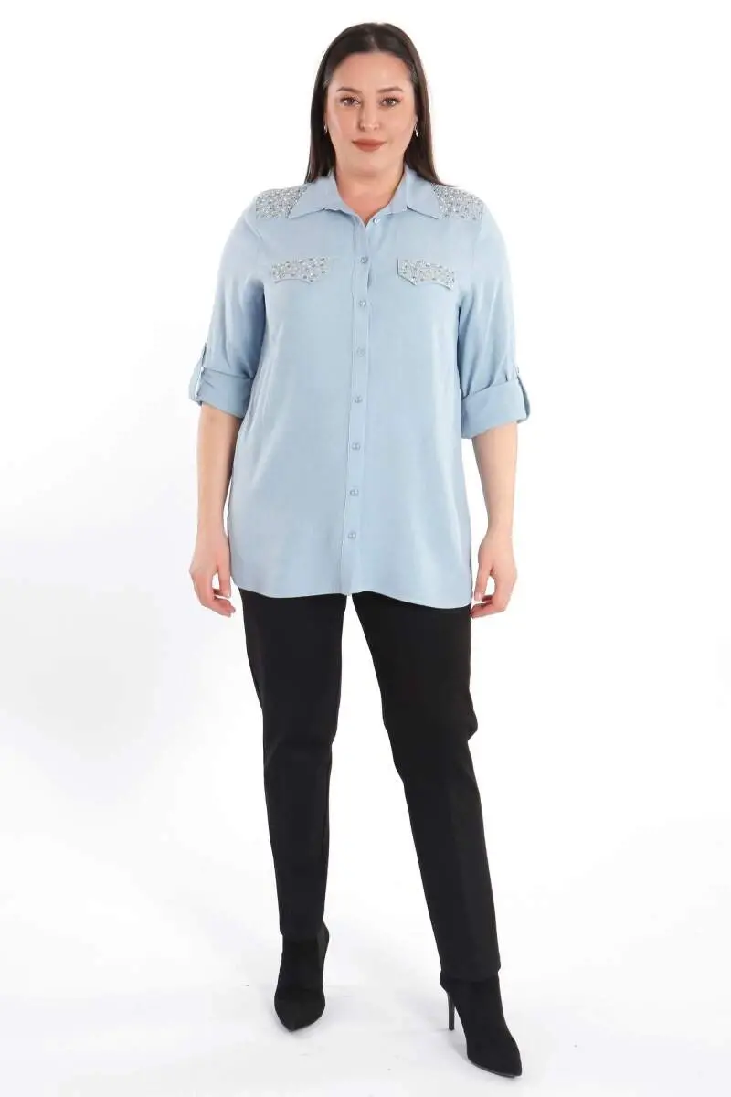 Angelino Büyük Beden Taş Baskılı Mavi Dokuma Gömlek
