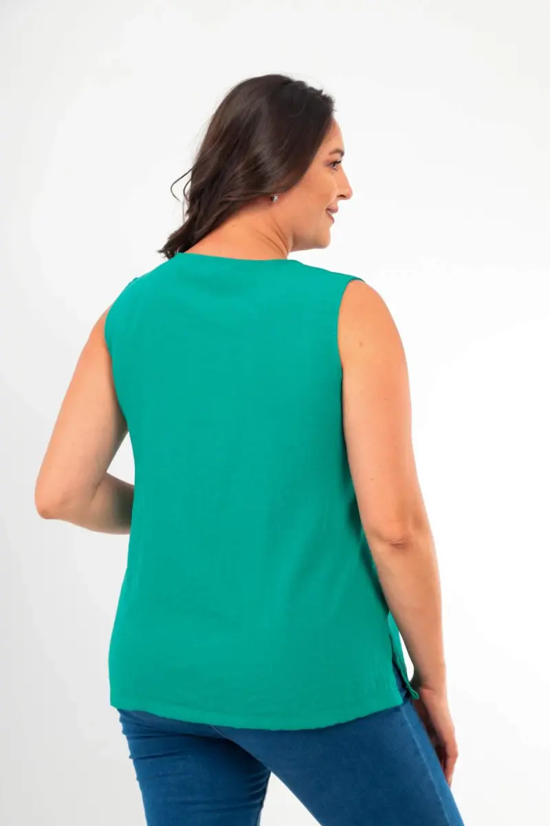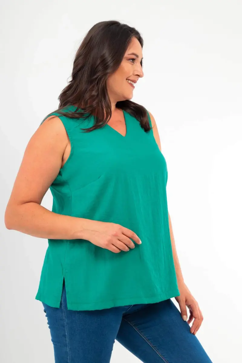 Angelino Büyük Beden V yaka Yırtmaç Detaylı Kolsuz Yeşili Bluz