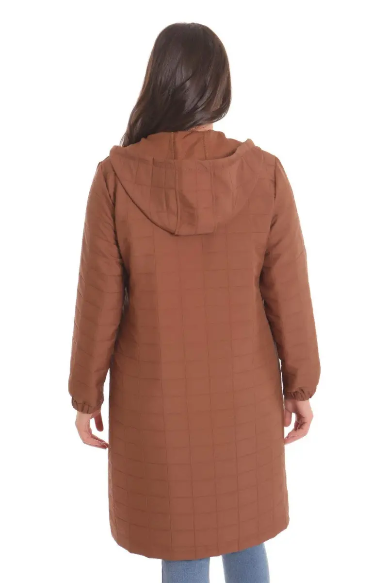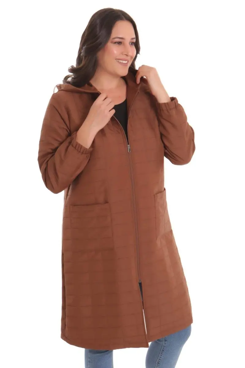 Angelino Büyük Kareli Desen Fermuarlı Kahverengi Kap Ürün Özellikleri: Kapitone kumaş ve cep detaylı Fermuar detaylı Kapitone kapüşonlu Su itici kumaş Renk: Kahverengi Malzeme: %100 Poliester Manken Ölçüleri: Omuz: 47 cm. - Göğüs: 97 cm. - Basen: 105cm - Bel: 80 cm. - Boy: 1,79 cm. Ürün boyu: 93 cm. 'dir. Model Bedeni: 44