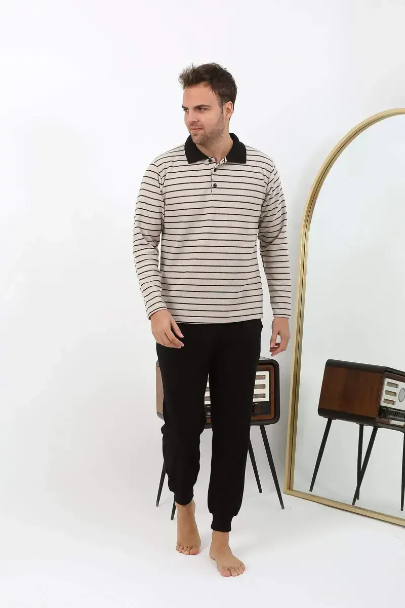 Angelino Erkaklar uchun uzun yengli polo yoqali triko pijama to‘plami 6862 krem