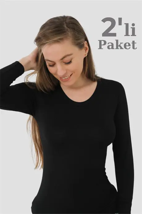 Angelino İç Giyim, kadın badi, siyah badi, uzun kollu badi, 2'li paket, %100 pamuk, rahat, nefes alabilen, esnek, yerli üretim, kaliteli iç giyim