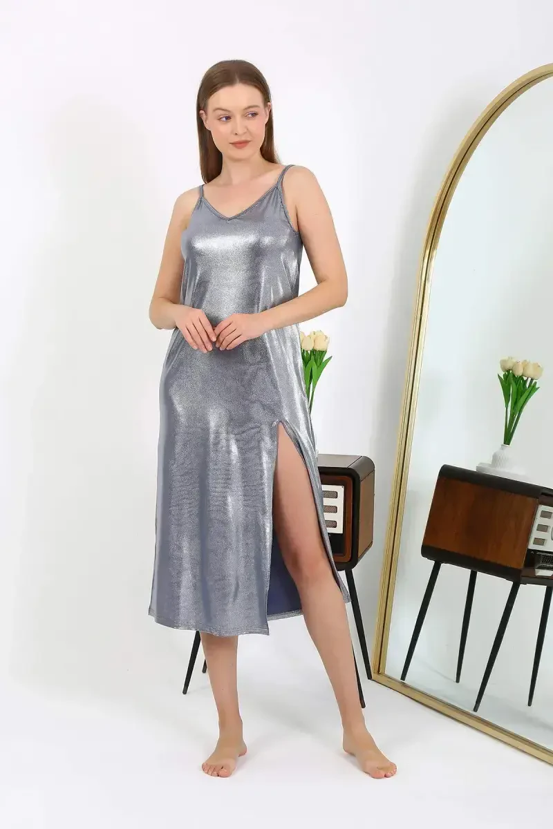 The Angelino Women's Spaghetti Strap Long Shiny Micro Dress Nightgown 7415 Gray is the perfect choice for women seeking both style and comfort. Its elegant design and eye-catching shine will make you look dazzling day and night. Made from micro fabric that is soft and silky to the touch, this nightgown offers all-day comfort while maintaining a stylish appearance. Its thin straps and long cut gracefully hug your body, creating a feminine silhouette. The gray color complements any combination, making this nightgown an indispensable part of your wardrobe. Suitable for relaxing at home or as a chic lingerie option for special occasions, the Angelino 7415 Gray nightgown, with its quality craftsmanship and timeless design, will accompany you for many years. Experience the comfort and style of Angelino on special occasions or whenever you want to pamper yourself. The shiny fabric, with its light-catching properties, offers a dazzling look, while the comfortable cut ensures your comfort throughout the day. This special nightgown is designed with subtle details that will make you feel special. With its superior quality, the Angelino 7415 Gray nightgown will remain as good as new for many years, offering you more than just comfort and style. Order yours now and feel the Angelino quality!