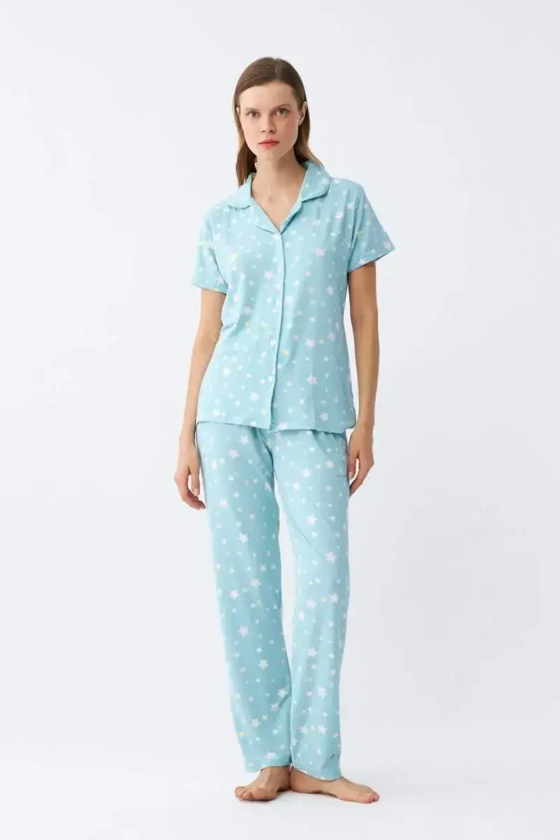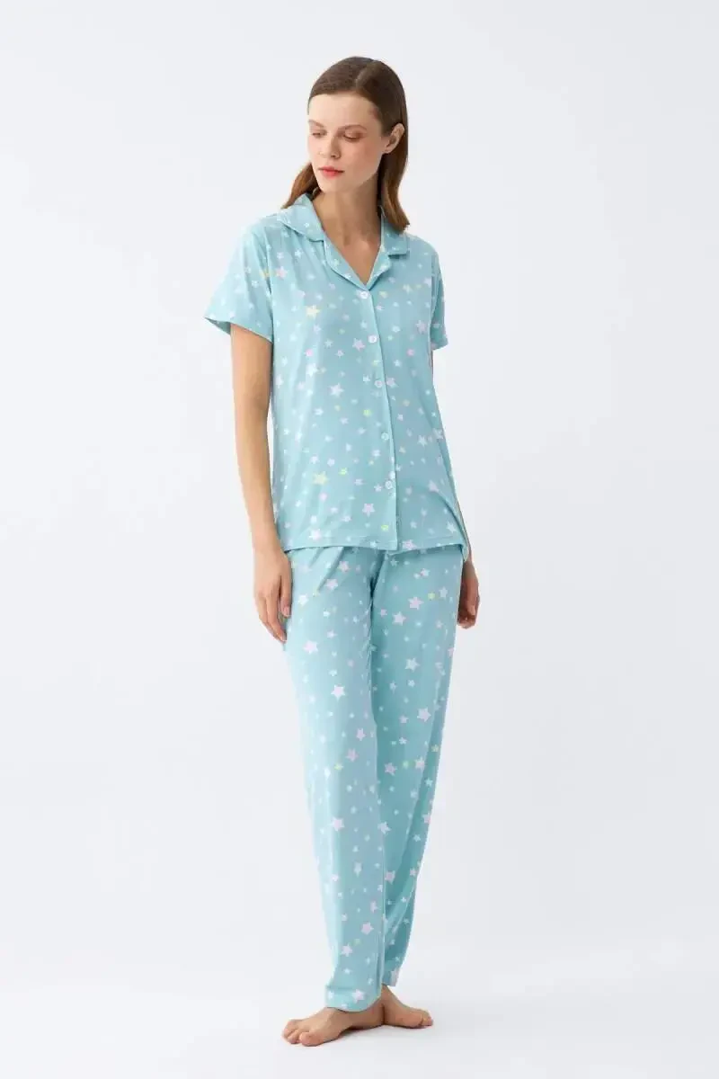 Подарите своим ночам волшебное сияние звезд с женской пижамой Angelino цвета льдисто-голубого с рисунком звезд и застежкой на пуговицы спереди. Этот уникальный пижамный комплект - не просто одежда, а идеальное сочетание комфорта и стиля. Пастельные звездные узоры, тщательно расположенные на льдисто-голубом фоне, предлагают как привлекательную эстетику, так и приглашают вас в расслабляющую атмосферу. Подобно звездам, сияющим в ночной темноте, эта пижама отразит ваше сияние.Верх с застежкой на пуговицы спереди придает пижамному комплекту классический и вневременной вид, а обновленный дизайн с современными акцентами привлекает внимание. Легкость застегивания и расстегивания пуговиц обеспечивает легкость в одевании, предлагая удобное использование без ущерба для вашего стиля. Этот дизайн - отличный выбор, чтобы сопровождать вас, когда вы отдыхаете дома или принимаете гостей.Благодаря легкой и дышащей хлопковой ткани пижамный комплект Angelino нежно касается вашей кожи и обеспечивает комфорт в течение всего дня. Благодаря своей не вызывающей потоотделения структуре, вы можете наслаждаться комфортным сном даже в жаркую погоду. Мягкая текстура ткани позволяет вам легко погрузиться в сладкие сны, не раздражая кожу.Женская пижама Angelino цвета льдисто-голубого с рисунком звезд и застежкой на пуговицы спереди - это идеальный выбор не только для сна, но и для приятных моментов, которые вы проводите дома. Читая книгу, смотря фильм или общаясь с близкими, вы всегда будете чувствовать себя хорошо благодаря комфорту и стилю этой пижамы. Засыпая ночью сладким сном и просыпаясь утром отдохнувшим, пижама Angelino станет вашим лучшим другом.Этот пижамный комплект сочетает в себе классическую форму пижамы, сочетающую в себе стиль и комфорт, с современными деталями. Он разработан для женщин, которые любят комфорт и не хотят идти на компромисс со стилем. Этот пижамный комплект, который станет незаменимой частью вашего гардероба, обещает вам каждую ночь такой же яркий и спокойный сон, как звезды. Выберите женскую пижаму Angelino цвета льдисто-голубого с рисунком звезд и застежкой на пуговицы спереди, чтобы побаловать себя и сделать свои ночи более приятными. Помните, комфорт и стиль могут быть вместе!