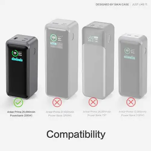 Please ensure the model is compatible beforehand to avoid any mistakes! Perfectly suitable for Anker Prime 20,000mAh 200W Power Bank: Equipped with a 1/4-inch screw hole, TF/SM card slot, and a SIM pin storage slot. Beyond protecting the power bank and facilitating portability in daily use, it can also be used for camera charging and mounted on a camera tripod. The camera's memory card and other accessories can be conveniently stored. Charging won't be affected by the base: The charging base has a detachable design. For charging, unfold the bottom silicone part or fold it back into the case. This flexible design ensures optimal protection for your power bank, whether you're charging or not. Lightweight and Protective: This lightweight case offers robust protection for your Anker Prime Power Bank without adding unnecessary bulk. Its slim design ensures a comfortable grip and easy portability. Precisely molded for a perfect fit: The case fits the power bank snugly without obstructing any necessary areas, such as the display screen and rated power information required for air travel. No worries about daily use. Screen-Friendly Fit: The case offers a snug fit while ensuring unobstructed screen visibility. It also conceals any unsightly white edges caused by the power bank's bend. Tailored to meet your needs, the case measures 5.1" x 2.36" x 2.36". Please note that TF/SM card and SIM pin are not included.