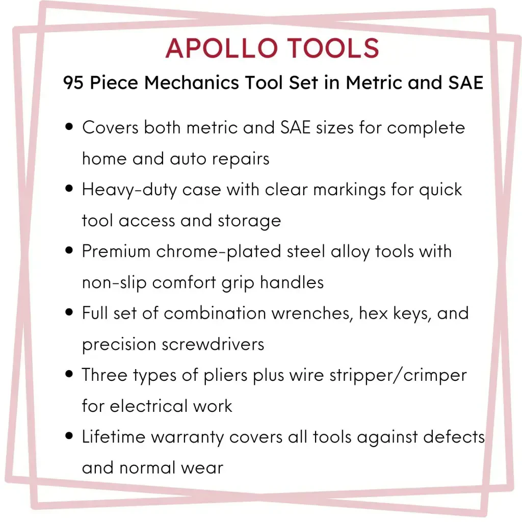 The Apollo Tools DT1242 Mechanic's and General Repair Tool Set is the perfect solution for your home projects. Apollo Tools' new and improved 95-piece mechanic's tool set includes all the sockets, wrenches, and pliers you need in both metric and SAE sizes for small engine and other mechanical repairs. This comprehensive set will help you with any repair and maintenance work you perform in your garage, workshop, or home. This well-organized tool bag allows all components to be found and replaced quickly and easily. The tools are neatly placed in a newly designed heavy-duty case with strong hinges and a carrying handle. This feature provides maximum tool space while remaining compact for convenient carrying and storage. The set includes metric and SAE socket sets, including the most commonly used 1/4" and 3/8" sockets and automotive tools. This way, you will always be prepared for repairs in the garage, workshop, and at home. Not only sockets and wrenches, but also many useful hand tools such as pliers, adjustable wrenches, combination wrenches, ratchet wrenches, ratchet bit holder, SAE and metric Allen wrenches, wire brush, wire stripper are also available in this set. The sockets are arranged upright for easy access and have clear markings on both the case and the sockets. The most needed mechanical tools have been brought together. This set includes sockets, combination wrenches, Allen wrenches, wire stripper, three types of pliers, two adjustable wrenches, ten combination wrenches, and more. Upgrades to our best-selling mechanic's set include a more compact case, the addition of channel-lock pliers, more precision screwdrivers, an upgraded ratchet system, and ergonomic handles on the pliers for added comfort during use.