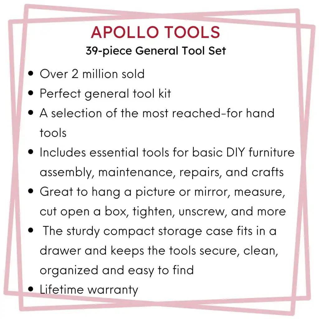 Apollo Tools DT9706 39 qismli qo'l asboblari to'plami dunyo bo'ylab 1 milliondan ortiq sotilgan asl umumiy asboblar to'plamidir. Bu uyingizdagi asosiy ta'mirlash ishlari uchun ajoyib boshlang'ich to'plam va ajoyib sovg'a g'oyasi. Rasm osib qo'yishdan tortib, quti ochishgacha, vintani mahkamlashgacha bo'lgan ko'plab oddiy uy ta'mirlash ishlari uchun eng foydali asboblarni o'z ichiga olgan ixcham to'plam. Ushbu to'plam bilan uyingizdagi kichik ishlarni osonlikcha hal qilishingiz mumkin. Bardoshli va ixcham saqlash sumkasi tufayli asboblaringiz xavfsiz, toza, tartibli va oson topiladi. Apollo Tools’ning umrbod kafolati bilan siz ushbu asboblar to'plamiga uzoq yillar ishonishingiz mumkin. Yuqori sifatli po'lat qotishmasidan tayyorlangan va korroziyaga qarshi xrom qoplamali asboblar qo'shimcha moment uchun sirpanmaydigan qulay tutqich dastalariga ega va oddiy foydalanishda umrbod chidamlilikni ta'minlaydi. Ushbu to'plam uyingizdagi har qanday asosiy ta'mirlash ehtiyojlari uchun ideal yechimdir.