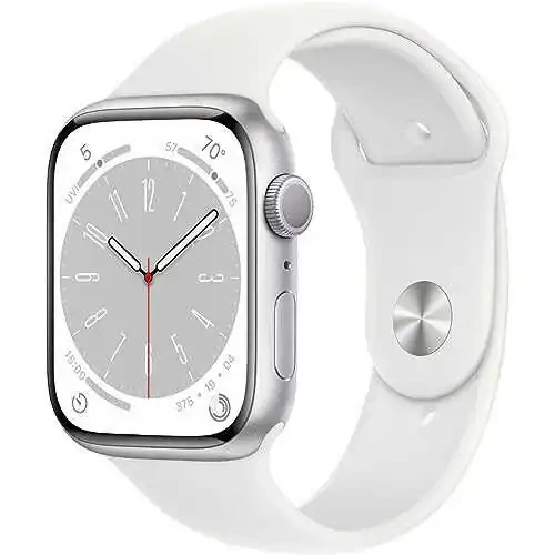 renewed apple watch series 8, apple watch 8 gps, 45mm apple watch, silver aluminum case, white sport band, apple watch series 8 price, renewed smartwatch