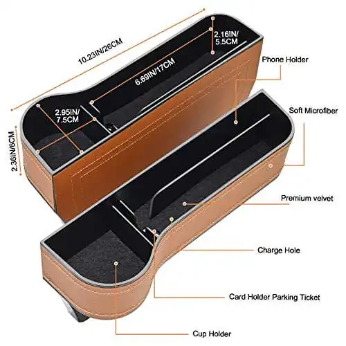 Say Goodbye to Mess - If you have problems on losing things in your car seat gaps, the car seat organizer front seat gap filler is for you. It prevents small items from falling between the car seat gap, gives you a place to put change, pens, toll cards, and other necessary ‘car items’ and keeps them within reach. New Version Car Seat Gap Filler - This car seat organizer has a good texture that feels like a baby's skin that is fine and smooth. The car storage organizer front seat is made of high-quality black ABS plastic and PU leather that cannot break, slip, bend or leave any scratches. With a velvet material pads that can prevent items from sliding and rattling. Fashion Design and Driving Safety - This front seat gap filler will help you create a neat and clean environment. This seat gap filler fits the car seat gaps. Because it will not shake when you brake suddenly, and it is not too big to waste your car seat space. The new design added brown stitching which adds to the overall appearance. Make your car more outstanding among friends. Perfect Size Car Storage Organizer- Not suitable for car seat gaps wider than 0.78 inches(2 cm. ) and central console lower than the seat. The size of the car seat gap organizer is 10.23 x 6.49 x 2.95 inches which is suitable for most vehicles. The cup holder can fit cups up to 2.75 inches in diameter. Just like the size of aluminum Coca-Cola. Please measure the distance between your seat and the console carefully before you purchase. Excellent Service - 2 car seat back hooks and 1 microfiber cleaning cloth as the gift. We provide one year of free replacement of this car seat gap filler with cup holder and 6 months of quality assurance. Please rest assured to buy. If you are not 100% satisfied with your order, please email us directly, we promise to provide every customer with quality products and services.