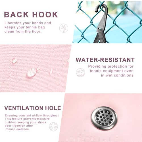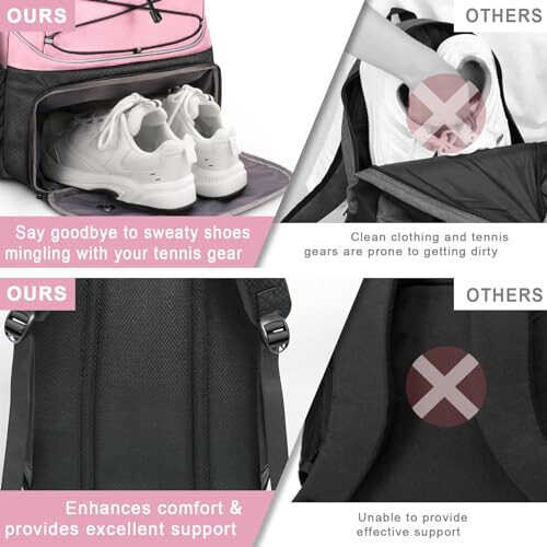 Large Tennis Bag: The racquet compartment features a soft cushion in the middle, capable of holding 2 tennis or pickleball racquets. The rackets compartment is designed to limit racquet movement by anti-slip dual zippers. The main compartment can store sports clothing, tennis gear, towels, and other equipment Thoughtful Design: The womens tennis bag features an insulated waterproof compartment and a ventilated shoe compartment. The insulated compartment keeps beverages fresh for hours or holds damp clothing and towels, ensuring the dryness of other items. The shoe compartment is designed for sneakers, equipped with two ventilation holes to prevent odors. The interior utilizes polyester fiber material that can be pulled out for easy washing Premium Materials: Crafted from high-density 900D polyester, the pickleball backpack for women offers excellent water-resistant, stain-resistant, and tear-resistant properties. Considerate Backpack Design: The tennis backpack's back aligns with the body's contours, distributing shoulder stress evenly. With 2 adjustable shoulder straps catering to different heights, the tennis backpack for women features neat stitching and reinforced areas in load-bearing regions, ensuring both comfort and durability. Ventilation structures on areas in contact with the body reduce back moisture, keeping you refreshed during activities Multi-Purpose: As a professional tennis racket bag, it can also be used for other outdoor activities such as pickleball, badminton, squash