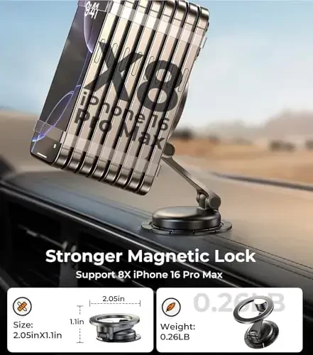 AREDAN Складной автомобильный держатель для телефона с креплением Magsafe - идеальный способ безопасно и стильно использовать телефон в автомобиле. Этот продукт, изготовленный полностью из металла, занимающий минимум места и имеющий складную конструкцию, идеально совместим с iPhone 16/15/14/13/12 Pro Max и другими смартфонами. Независимо от того, установите ли вы его на приборную панель, лобовое стекло или вентиляционную решетку, автомобильный держатель для телефона AREDAN поднимет ваши впечатления от вождения на новый уровень. Благодаря мощным магнитам MagSafe вы можете легко разместить и зафиксировать телефон одной рукой. В отличие от классических автомобильных держателей, этот продукт предлагает вам простоту использования, долговечность и эстетичный внешний вид. Благодаря вращающемуся на 360° основанию и складной алюминиевой ручке вы можете настроить угол обзора по своему усмотрению и легко сложить его для экономии места, когда он не используется. Кроме того, этот держатель, являющийся идеальным решением для прокатных автомобилей, легко устанавливается и снимается благодаря вакуумному клею, не оставляющему следов. Автомобильный держатель для телефона AREDAN - это не просто аксессуар, это инвестиция, которая повышает вашу безопасность во время вождения и заботится о вашем комфорте. Прочная металлическая конструкция из высокопрочного алюминиевого сплава обеспечивает длительный срок службы, а стильное анодированное покрытие придает вашему автомобилю современный вид. Неодимовые магниты N52 гарантируют, что ваш телефон останется на месте даже на ухабистых дорогах. Уникальная конструкция кольцевой вентиляции предотвращает перегрев телефона и сохраняет его производительность. Сверхпрочный вакуум с двухступенчатым механизмом блокировки обеспечивает в 3 раза большее сцепление по сравнению со стандартными держателями и выдерживает температуры от -40°F до 203°F. Благодаря нано-гелевому клею вы можете использовать держатель несколько раз и восстанавливать его липкость, промывая водой при необходимости. Складной автомобильный держатель для телефона AREDAN совместим не только с пользователями iPhone, но и со всеми марками смартфонов Apple, Samsung, Google и другими благодаря магнитной пластине. Это идеальный выбор для всех, кто хочет безопасно и комфортно пользоваться телефоном во время вождения.