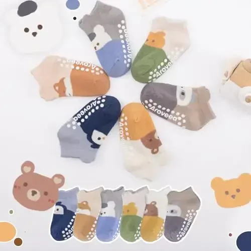 Combine safety and comfort for your little ones with Aroveea Baby Toddler Grip Socks! This set of 12 cotton socks is a perfect choice for children aged 6 months to 7 years. They are specifically designed to prevent babies and toddlers from slipping and falling while playing and exploring. Thanks to its cotton-rich blend, its soft texture, medium thickness, and breathable structure offer comfort in all seasons. Aroveea socks combine elegance and functionality, ensuring that your baby's feet always stay warm, safe, and adorable. The non-slip silicone grips on the soles of the socks provide excellent traction, especially on slippery surfaces, reducing the risk of falls. This feature ensures that your baby is safer when running, jumping, or playing on parquet floors or tiled areas. Ideal for daily use, these socks can be easily worn inside shoes, and the grips do not make it difficult to wear shoes. Made from high-quality cotton and synthetic fibers, these socks offer a perfect balance between comfort and durability. The elastic and flexible fabric prevents the sock from slipping or falling off, even as your baby's foot grows, while the soft and breathable structure keeps their feet comfortable and dry all day long. The grips on the soles retain their effectiveness even after multiple washes. Standing out with their thoughtful designs, these adorable socks provide extra support with elastic ribbed cuffs and an arch band at the top, helping the sock stay in place. The back pull tabs allow children or parents to easily put on and take off the socks. Their patterns are cute and their colors are very diverse, making them easily compatible with any outfit. Multiple size options are available, such as 6-12 months, 1-3 years, 3-5 years, and 5-7 years. Aroveea Baby Toddler Grip Socks, combined with improved safety, reasonable comfort, and durability, are an excellent gift option, especially with their various sizes, colors, and patterns. These packages, each consisting of 12 socks, are an ideal gift for Christmas, birthdays, Children's Day, and all other special occasions. Combine comfort and safety for your baby's or loved ones' little feet with Aroveea!