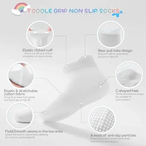 Детские носки Aroveea для малышей и детей — это специальный набор из 12 штук, в котором безопасность и комфорт малышей ставятся на первое место, а также выделяются симпатичным дизайном. Эти носки идеально подходят для детей от 6 месяцев до 7 лет и позволяют младенцам и детям свободно двигаться благодаря нескользящей подошве, сводя к минимуму риск падения. Эти носки, изготовленные из богатой хлопком смесовой ткани, обеспечивают комфорт в течение всего дня, подходят для использования в любое время года и помогают ногам дышать. Эти носки средней толщины не раздражают чувствительную кожу благодаря своей мягкой текстуре. Носки Aroveea, изготовленные из комбинации высококачественного хлопка и синтетических волокон, сочетают в себе комфорт и долговечность. Благодаря эластичной ткани они плотно прилегают к ноге вашего ребенка, даже когда она растет, и не спадают. Мягкая и дышащая структура обеспечивает сухость и комфорт ногам ваших детей в течение всего дня. Удерживающие точки на подошве носков сохраняют свою эффективность даже после многократных стирок. Эластичные ребристые манжеты и поясная лента обеспечивают дополнительную поддержку и помогают носку оставаться на месте. Задние язычки позволяют детям или родителям легко надевать и снимать носки. Благодаря симпатичным узорам и разнообразным цветам они легко сочетаются с любым нарядом. Доступны различные размеры, такие как 6-12 месяцев, 1-3 года, 3-5 лет и 5-7 лет. Нескользящие носки Aroveea не только повышают безопасность, но и обеспечивают достаточный комфорт и долговечность. Разнообразие размеров, цветов и узоров делает их чрезвычайно универсальными с точки зрения стиля. Этот пакет из 12 носков станет отличным подарком на Рождество, дни рождения, День защиты детей и все другие праздники. Это идеальный выбор для родителей, которые заботятся о здоровье и безопасности ног своих детей.