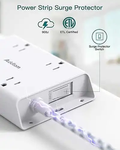【Wide Space Outlets Power Strip】-This desktop power strip features 4 AC outlets without blocking(1875W/125V/15A). The AC outlet with 2.4 inches space in between, larger than the standard 1.5-inch socket. Making it enough to fit big adapters and suitable for all kinds of equipment, home office college dorm room essentials 【Power Strip with USB C Ports】- Added extra 2 USB C ports for your devices, the USB C power strip can charge up to 5V/3A. USB-A ports can charge up to 5V/2.4A Max. The combination of 2 USB-C and 2 USB-A can be compatible with more usb devices, must-have accessories for college dorm room, home, office 【Right Angle Ultra Flat Plug 】 - With only 0.35 inch ultra thin plug and 45-degree right angle design, which is much slimmer than traditional plugs, which can close to the wall easily, and hide in the back of furniture, bed or refrigerator, no waste for every inch space for your home 【Overload Surge Protection】- The surge protector with overload protection protects your electrical appliances from lighting, surges or spikes. The minimum energy-absorbing capacity of 900 Joules. Lighted on/off switch with integrated circuit breaker for overload protection of all outlets 【Wall Mount Power Strip 】- No need to measure and guess where you had to attach screws, Addtam unique screw fixation design on both ends allow this white mountable power strip securely installed on the wall or under the desk (4 screws included)
