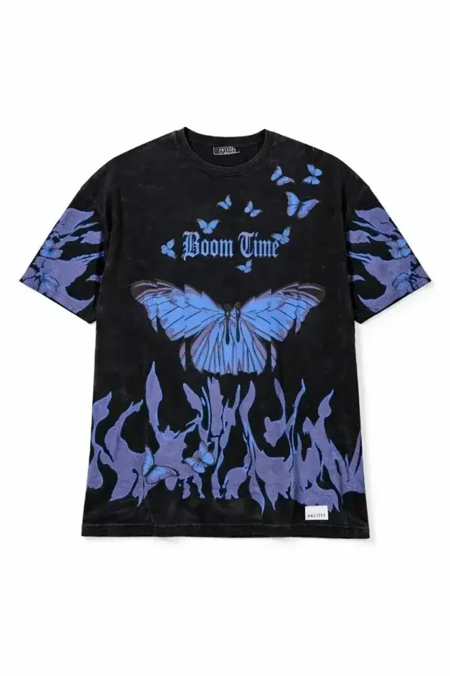 Asit Yıkamalı Oversize Tişört Mavi Kelebek Baskılı Dijital Print Bisiklet Yaka Streetwear T-Shirt - Siyah