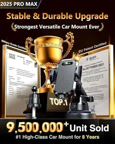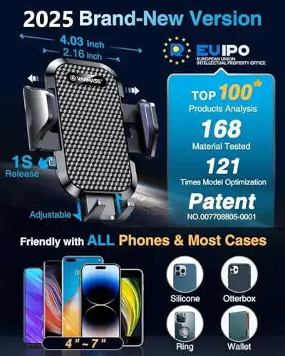 【True Military-Grade Certified, 2025 BEST Ultimate Model】VANMASS, the leader in high-end car phone holder. Over the past 8 years, We have listened to the voices of millions of users, rigorously tested to MILITARY GRADE standards (stability, compatibility, flexibility, security, durability). Finally, we overcome all weaknesses to design the Ultimate Model that we are most satisfied with. This item obtained international military-grade shockproof certification No. GZMR220601855501 【Larger Suction Cup, Strongest Suction】The diameter of the suction cup has been increased from 2.5in to 2.8in, and the PU adhesive has been applied to increase the suction power by 44%. Over 60 pounds of suction means even the heaviest phones are secure on bumpy roads. The suction cup is easy to remove and can be washed clean and reused. Attention: Install suction cup on a flat surface, avoiding curves or leather surface 【Multi-Function Phone Stand for Dashboard / Windshield / Vent】Are you not sure which installation would best suit your vehicle? No problem the unit is extremely flexible!!! Dashboard, Windshield even air vent, all places work perfectly! 【Longer & Firmer Hook Clip - Fit 99% vent】Its innovative hooked construction perfectly solves the shortcomings of the previous generation air vent clips which were prone to loosening! Maximum hook length increased by 57%, compatible with 99% Vertical / Horizontal vent. Longer build reduces obstruction of air flowing out of vent. Attention: Hook is not compatible with round, cross, or diagonal car vents 【High-end = Quality Materials + Grandmaster Design】VANMASS car phone mount made of PC+ABS material has passed 4 environmental reliability tests and has a temperature resistance range of -40℉ to 194℉, it is also highly resistant to UV rays (Ensuring reliability even in the sun), and the telescopic pole uses a reinforced sliding rail structure to greatly reduce wobbling during driving. This suction phone cradle obtained CP65 / REACH / RoHS safety certifications 【Smoother "One-Click Release" & Perfect Protection】 You can easily place or remove the phone with one hand. After 7 structural reliability tests, we have upgraded the internal parts of the phone holder to improve the experience of using the"One-Click Release" function, which is smoother and more reliable. We also have used a more flexible silicone arm to hold your phone more securely and prevent it from being scratched by plastic 【Free Angle Adjustment】The long arm telescopic pole offers 4.1in~5.8in length adjustment and 270° angle adjustment, while the back of the phone holder has a 360° rotatable ball, these flexible parts allow you to use your phone at the most comfortable angle 【Sturdy Hold Any Phone from 4 to 7 inch】To adapt to different phones and cases, VANMASS was the first to invent adjustable side clamps and feet. We have also designed a non-slip fingerprint area on the side clamps so that you can hold your phone more easily with one hand. This mount is compatible with all mobile phones between 4 and 7 inch, compatible with iPhone 17 Pro Max 16 15 14 13 12 11 XR X SE mini,for Samsung Galaxy S25 Ultra S24 S23 S22 S21 A53 A22,for Pixel,for Xiaomi,for Motorola, etc