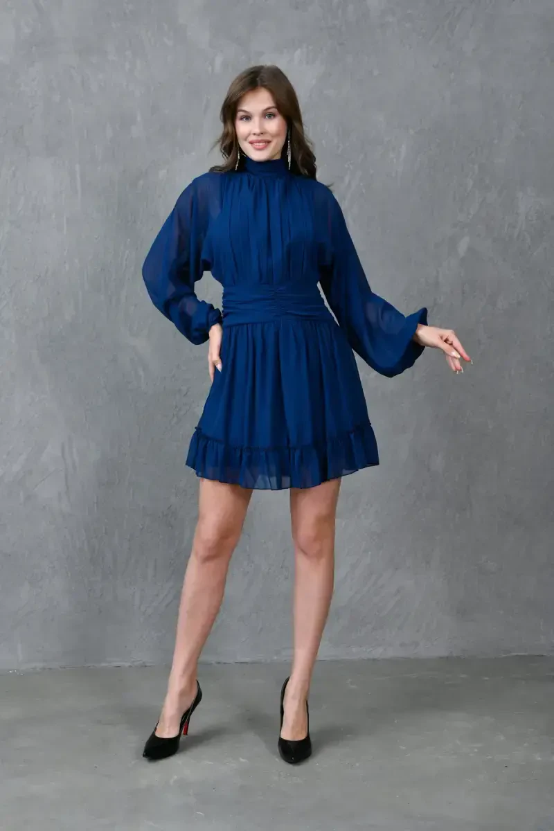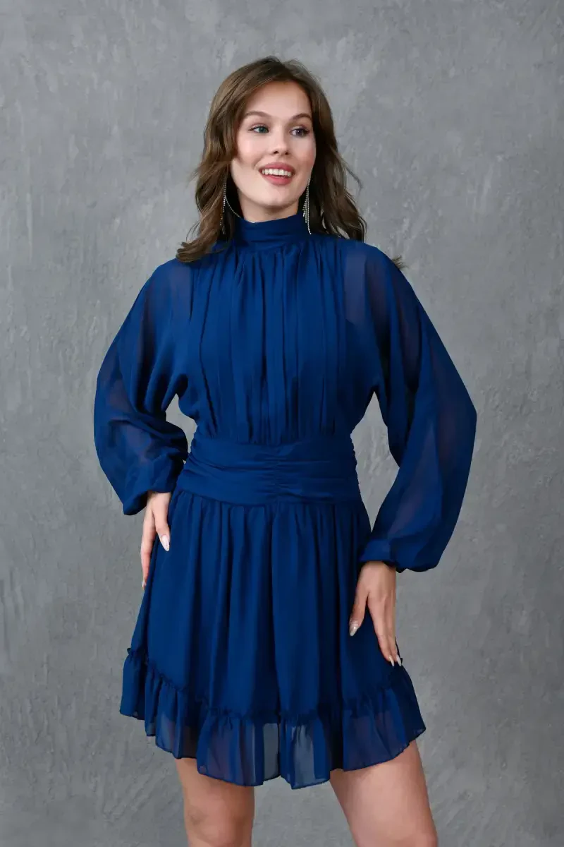 abiye elbise, şifon elbise, sırt dekolteli, balon kollu, lacivert elbise, astarlı elbise, özel davet, mezuniyet, kokteyl, zarif elbise