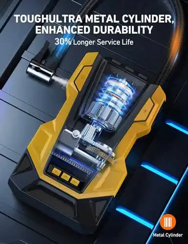 The AstroAI AC/DC Tire Inflator is a fast and reliable solution for inflating your cars, motorcycles, bicycles, balls, and other inflatable items. This portable air compressor features a multi-functional AC/DC dual power supply design, allowing it to be powered from both car cigarette lighters (12V DC) and wall outlets (110V/120V AC). With its high-pressure (150 PSI) metal motor, it can inflate a 195/65/R15 tire from 0 PSI to 36 PSI in just 5 minutes. Constructed with the advanced ToughUltra manufacturing process, its robust and durable build ensures long-lasting use. The automatic shut-off and memory function automatically stops the pump when the preset pressure is reached and saves the pressure setting for next use. Its illuminated digital LCD screen allows you to switch between PSI, BAR, and KG/CM² units, facilitating nighttime use. Thanks to its compact design and included carrying bag, it can be easily stored and transported. Ideal for cars, motorcycles, bicycles, sports equipment, and other inflatable products. 3 extra nozzles included provide compatibility with different valve types. The AstroAI AC/DC Tire Inflator allows you to quickly and easily inflate your tires and other inflatables on the road or at home. For extended use, allow the compressor to cool down for at least 10 minutes after every 15 minutes of operation. This will extend the life of the device and maintain its performance.